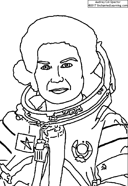 A coloring page of Soviet cosmonaut Valentina Tereshkova, the first woman in space.