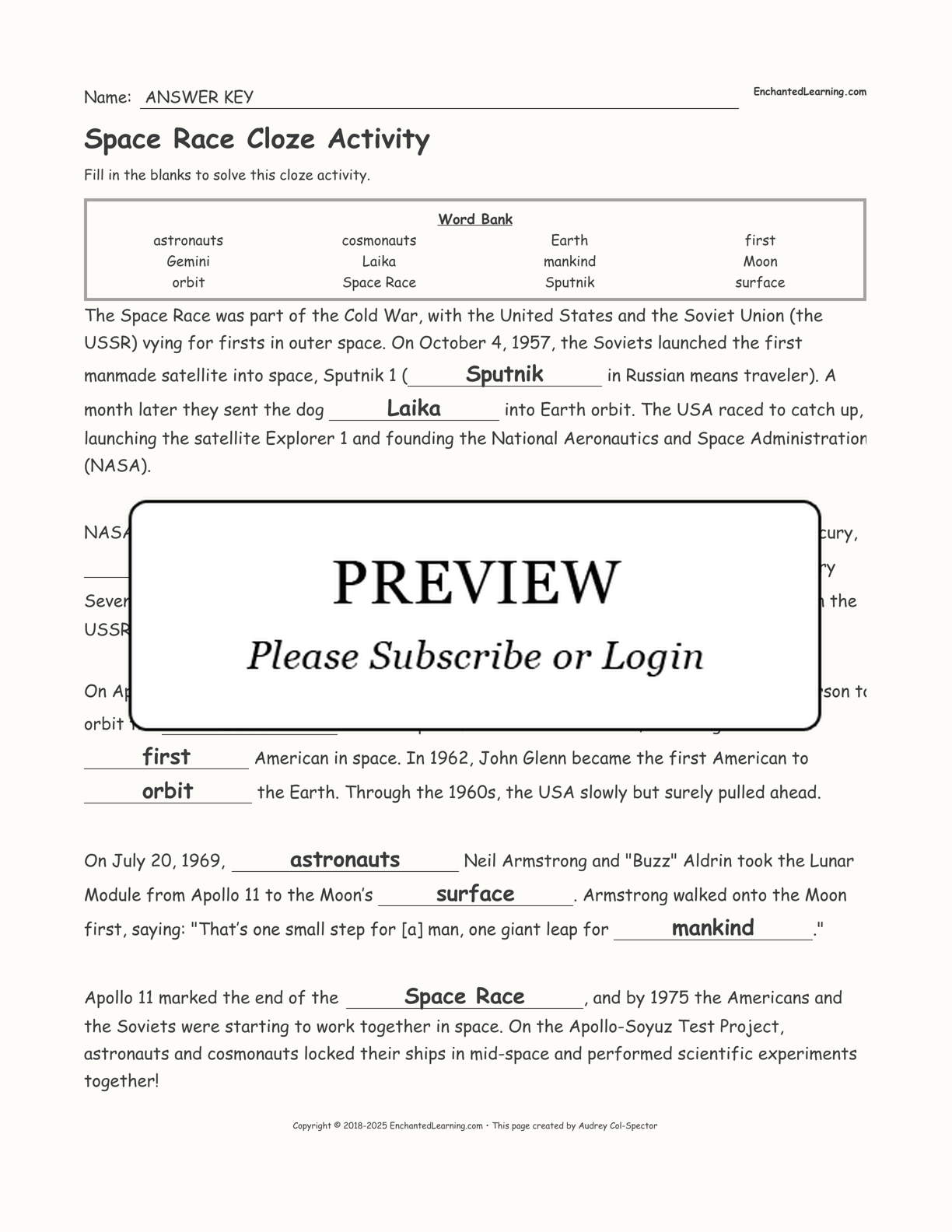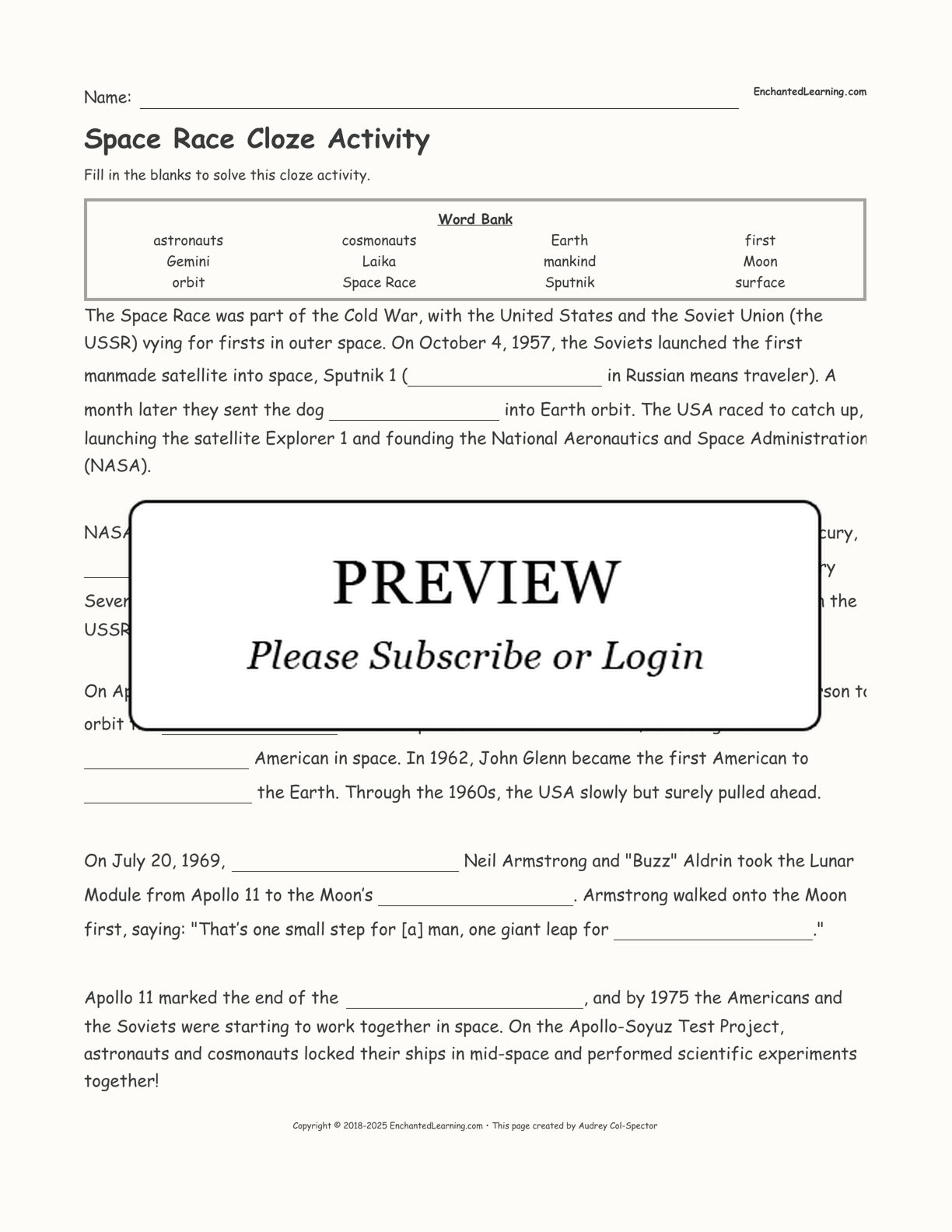 Space Race Cloze Activity. Fill in the blanks in this short summary of the race to land the first person on the Moon!