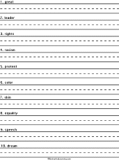 Match Each Word to Its Definition: Martin Luther King Jr. Match each Martin Luther King Jr.-related word to its definition (printable worksheet). Words: leader, dream, freedom, equality, racism, segregation, boycott, protest, assassinate, honor. Or go to the answers. |