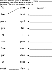 Match the Syllables: Martin Luther King, Jr. Words Match two syllables to make 10 Martin Luther King, Jr., words. The words are boycott, protest, equal, peaceful, civil, purpose, respect, freedom, greatness, unfair. Or go to the answers. |