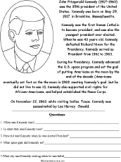 John F. Kennedy: Printable Worksheet A printable worksheet on President John Fitzgerald Kennedy, with a short biography, a picture to color, and questions to answer. Answers: 1. 1917, 2. Massachusetts, 3. 43, 4. Putting Americans on the moon by the end of the 1960s, 5. Dallas. |
