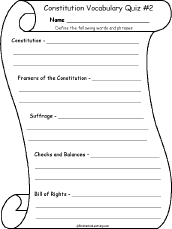 Vocabulary Quiz #2 Define five terms related to the US Constitution, including Constitution, Framers of the Constitution, Checks and Balances, Suffrage, and Bill of Rights. Or go to the answers. |