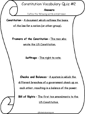 Vocabulary Quiz #2 Define five terms related to the US Constitution, including Constitution, Framers of the Constitution, Checks and Balances, Suffrage, and Bill of Rights. Or go to the answers. |