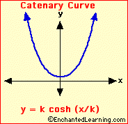 The equation for a catenary curve is: y = k cosh(x/k) , where cosh is the hyperbolic cosine [cosh(x) = (ex + e-x)/2] and k is the y-intercept (where the curve hits the y-axis).