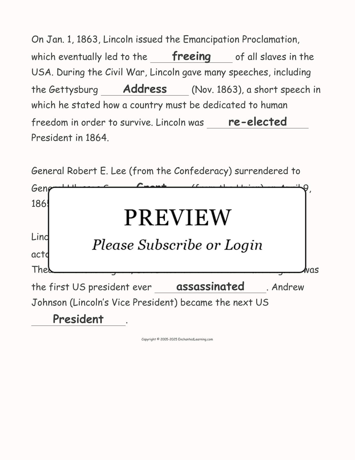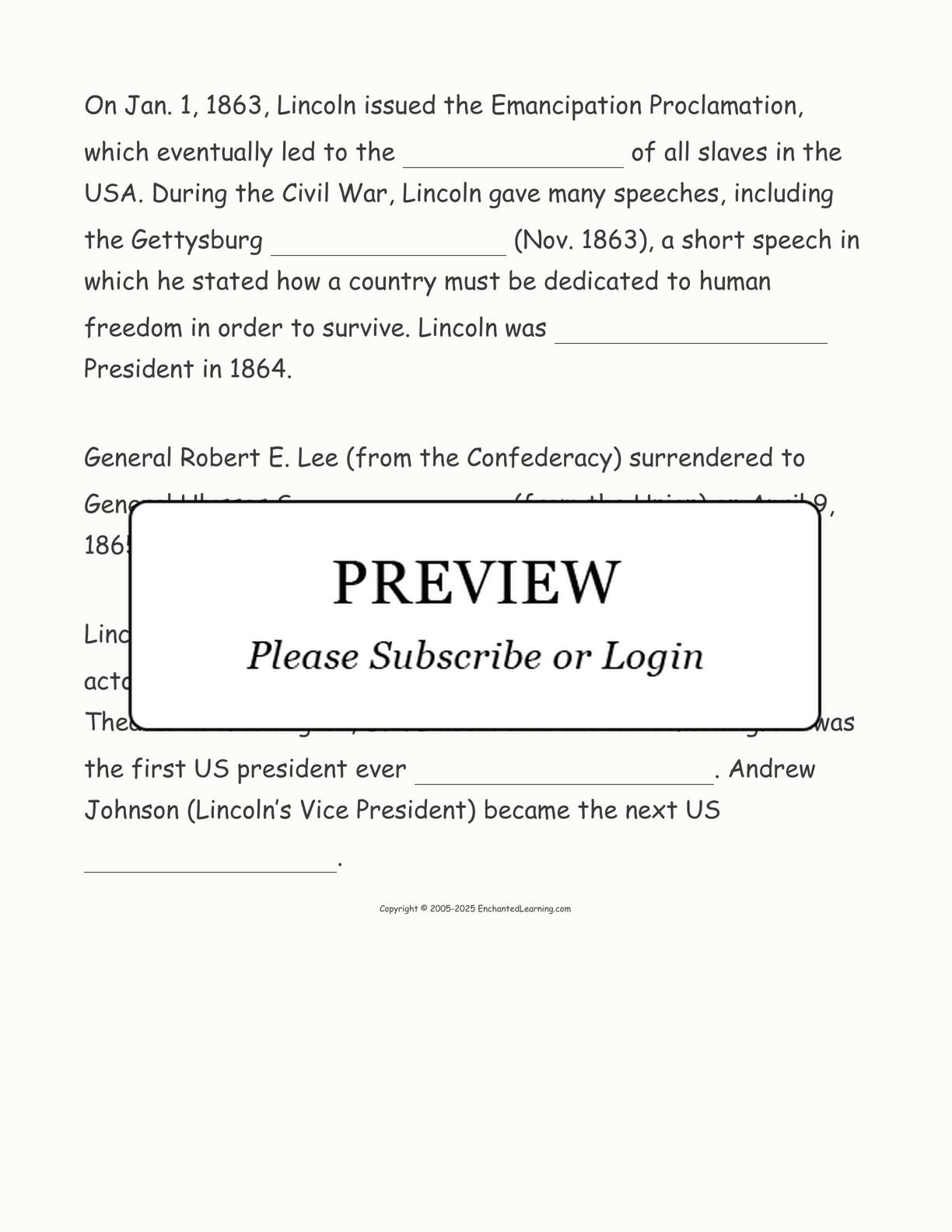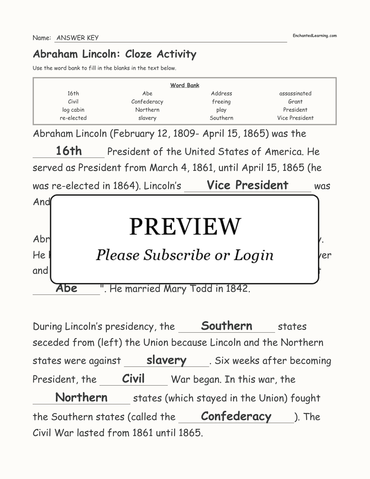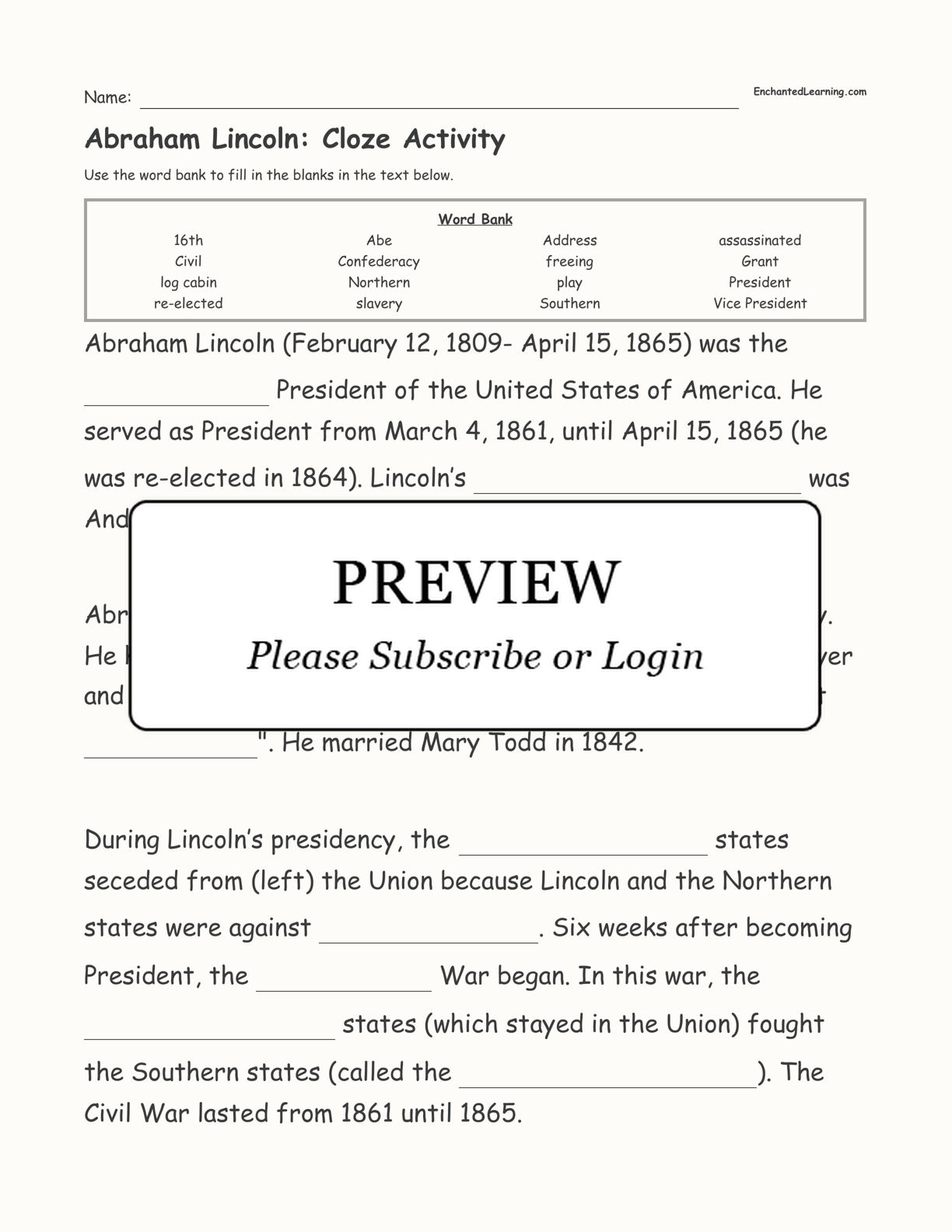 Use the word bank to fill in the blanks in this Abraham Lincoln cloze activity. This is a printable worksheet.