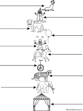 Label 10 Circus Words Label the pictures of 10 circus words on this worksheet. The words are: seal, clown, lion, balloon, juggler, horse, unicycle, tiger, elephant, tent. Go to the answers. |