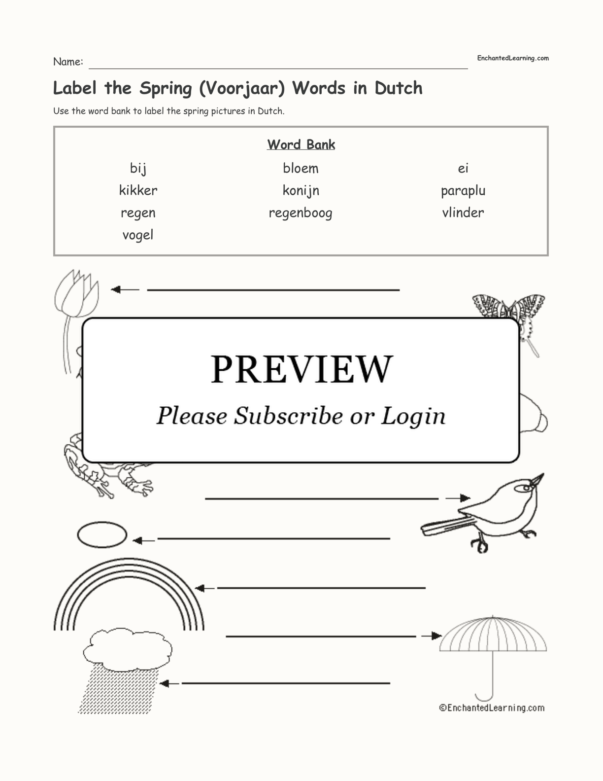 Use the word bank to label the spring pictures in Dutch.