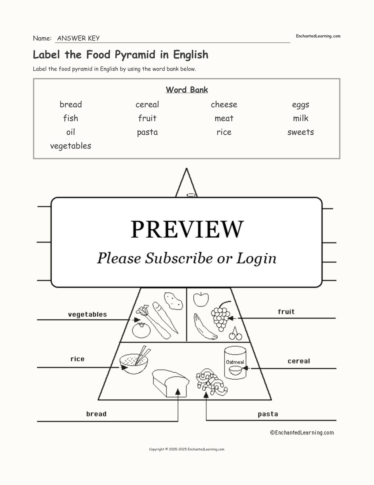 Label the food pyramid in English (using the word bank) in this printable worksheet.
