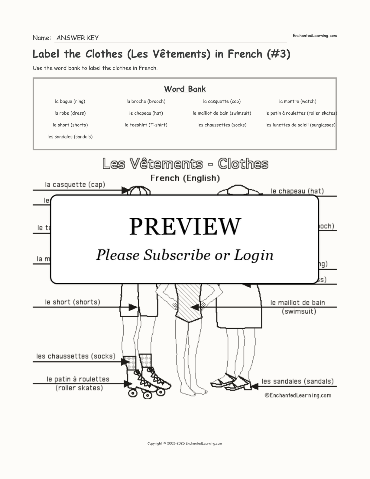 In this printable worksheet, label the clothes (Les Vêtements) in French using the word bank.