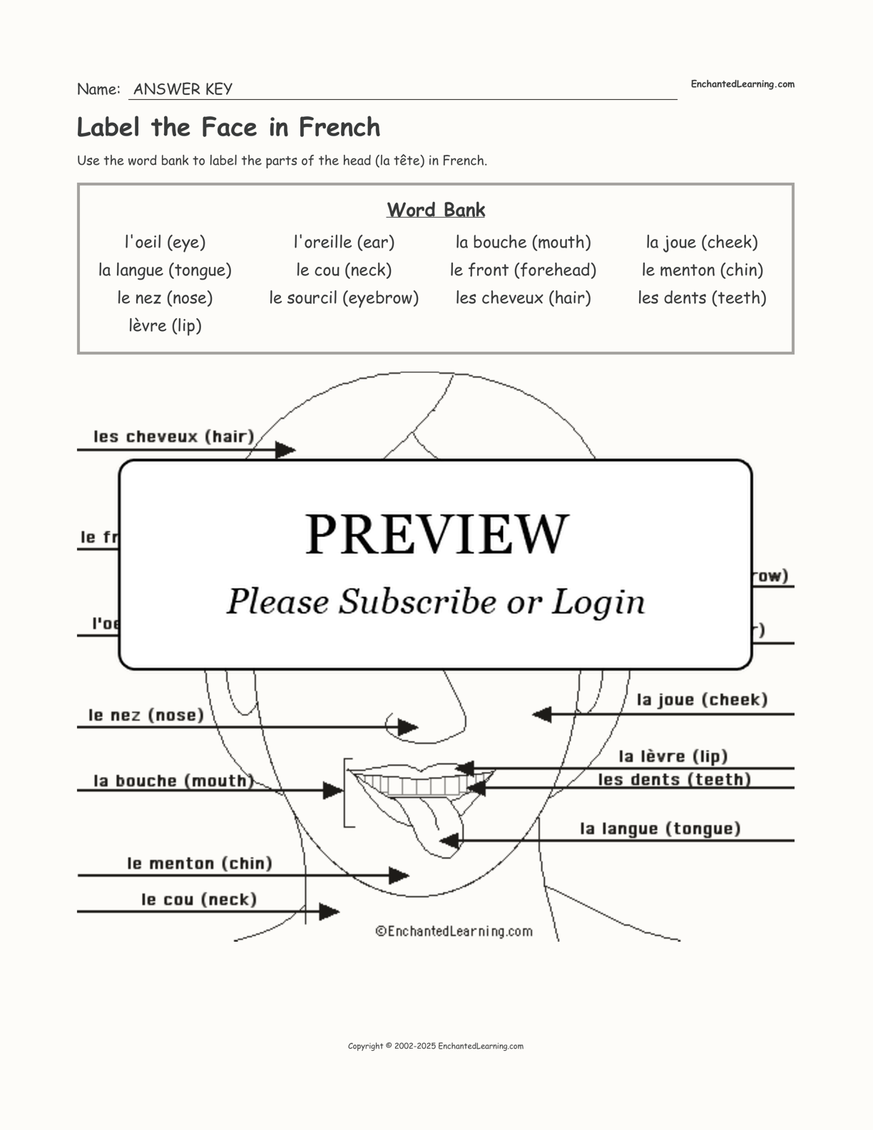In this printable worksheet, label the parts of the head in French using the word bank.