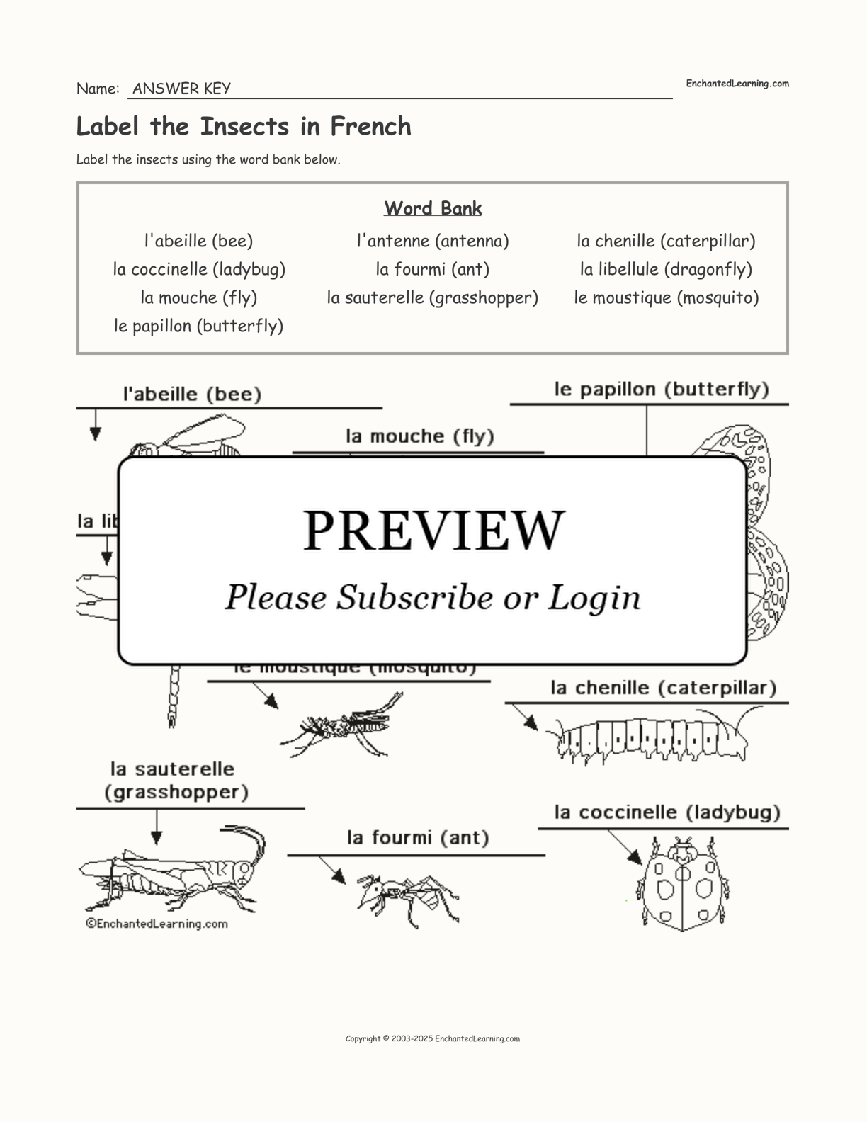 In this printable worksheet, label the insects in French using the word bank.