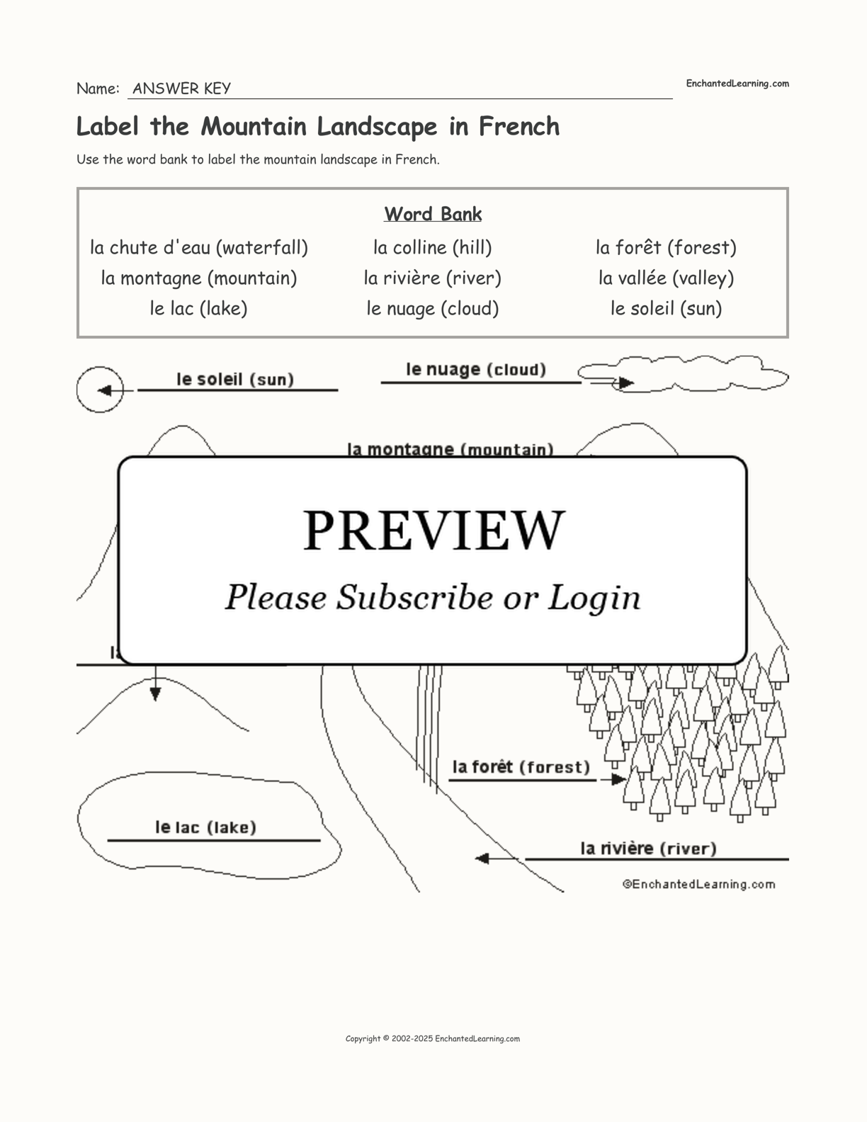 In this printable worksheet, label the mountain landscape in French using the word bank.