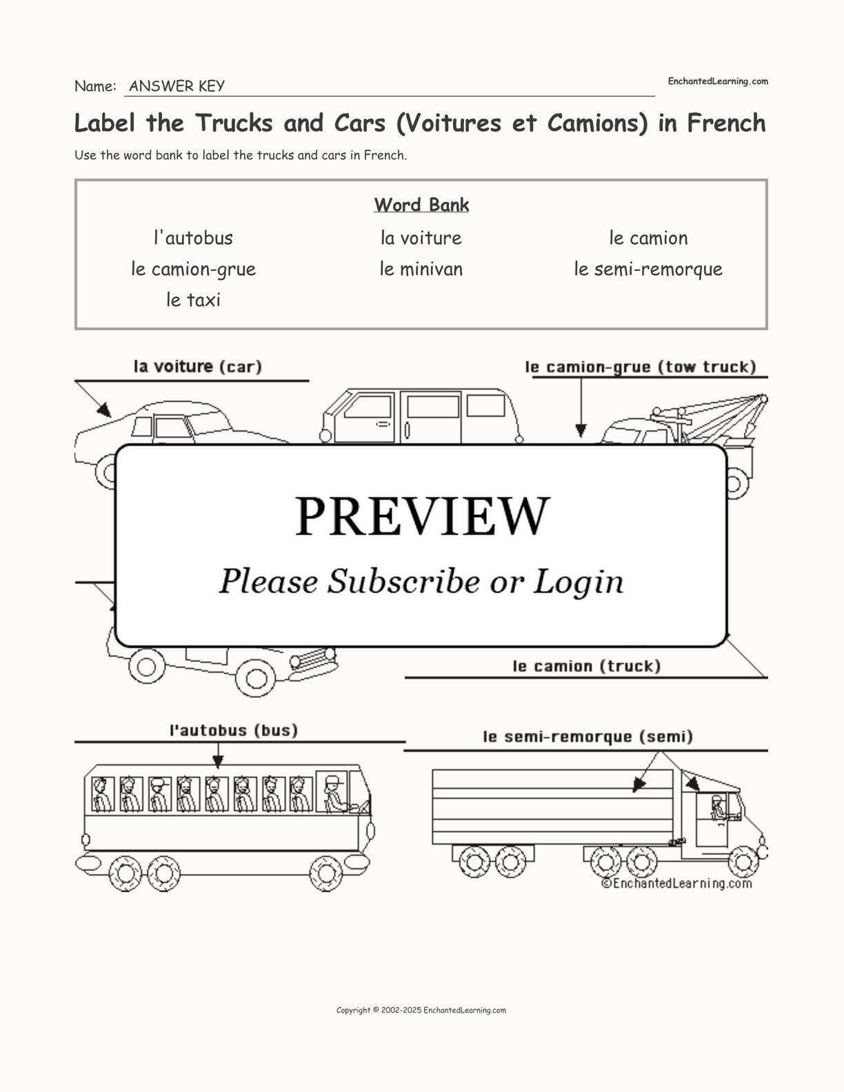 In this printable worksheet, use the word bank to label the trucks and cars (voitures et camions) in French.