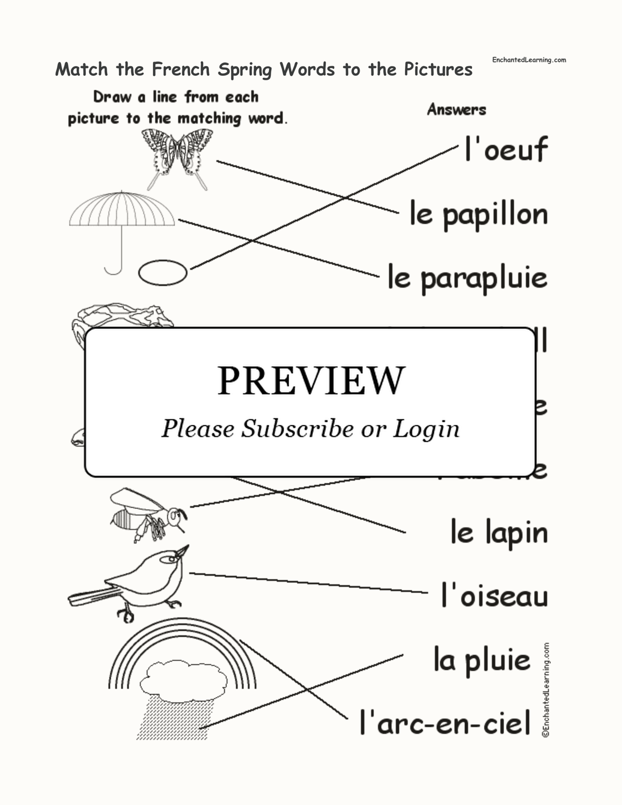 In this printable worksheet, match 10 Spring French words to their pictures. The words are: l’oeuf/egg, le papillon/butterfly, le parapluie/umbrella, le base-ball/baseball, la grenouille/frog, l’abeille/bee, le lapin/rabbit, l’oiseau/bird, la pluie/rain, and l’arc-en-ciel/rainbow.