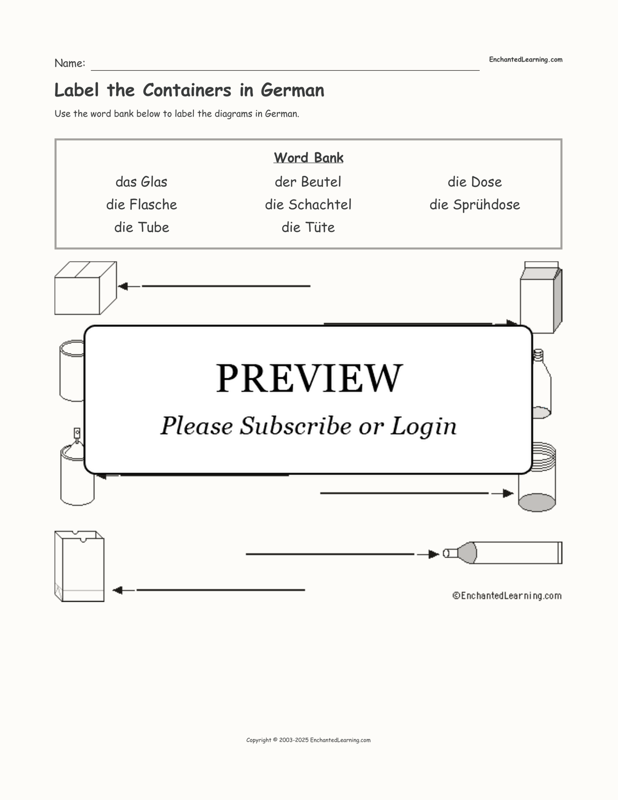 In this printable worksheet, use the word bank to label the containers in German.