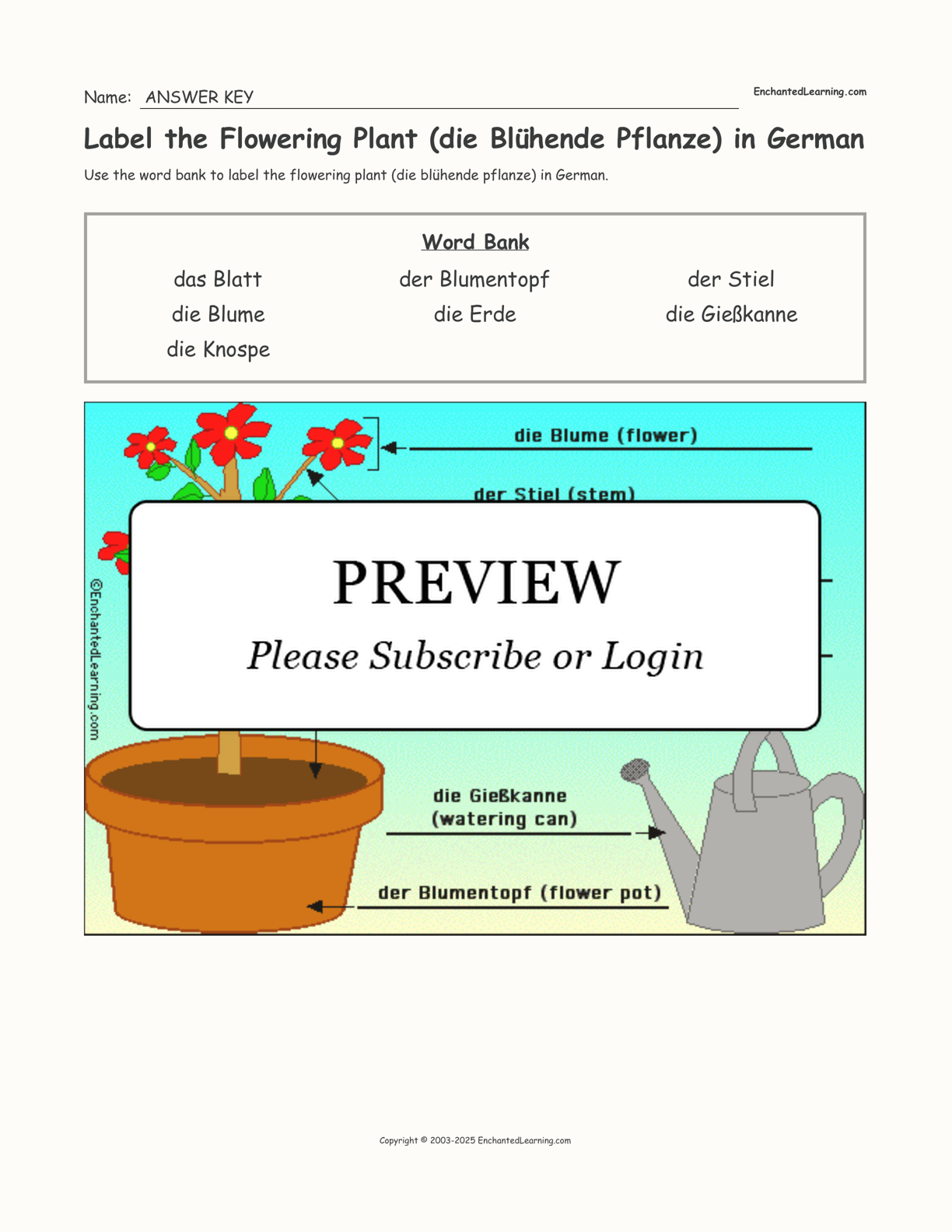 In this printable worksheet, use the word bank to label the flowering plant (die Blühende Pflanze) in German.