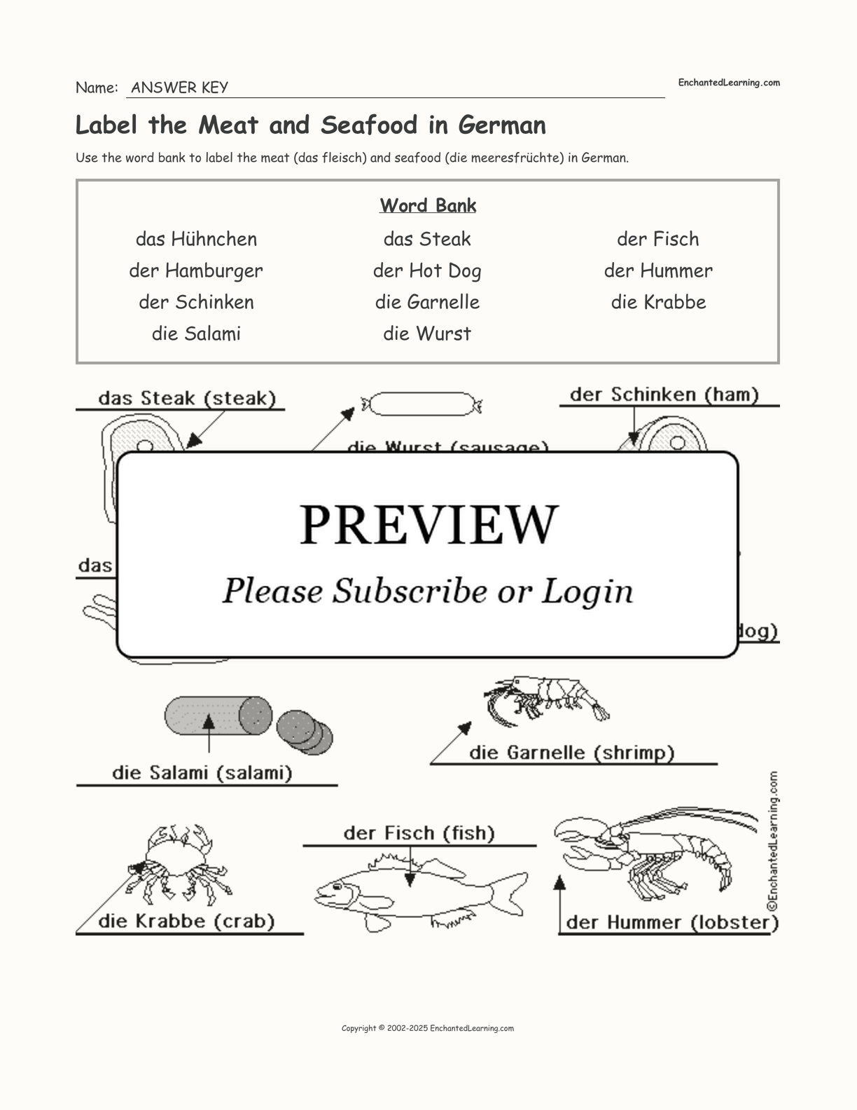 In this printable worksheet, use the wordlist to label the meat (das fleisch) and seafood (die meeresfrüchte) in German.