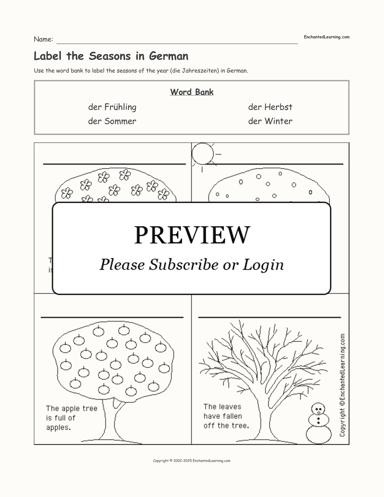 In this printable worksheet, use the word bank to label the seasons of the year (die Jahreszeiten) in German.