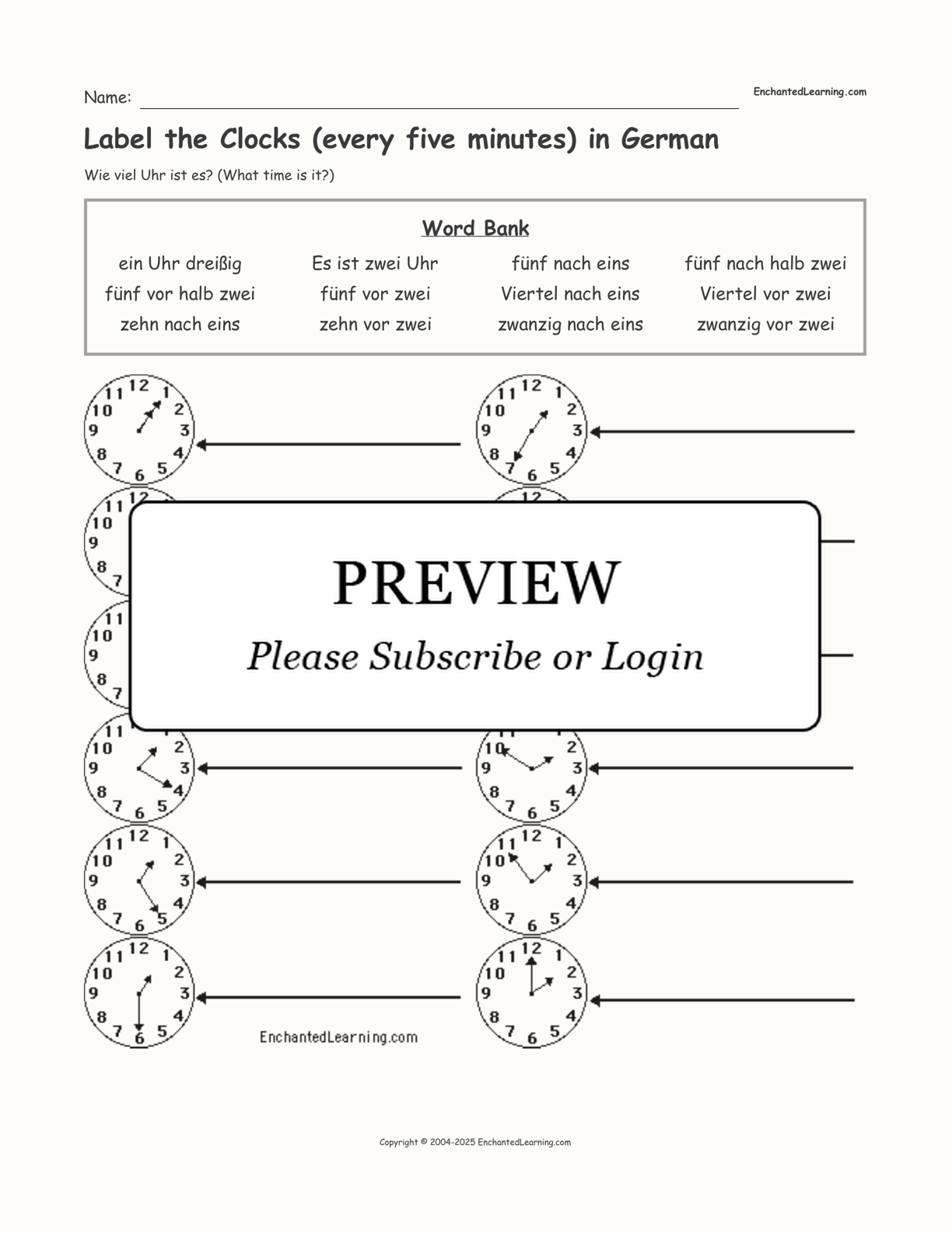 In this printable worksheet, use the word bank to label the clocks (every five minutes) in German.