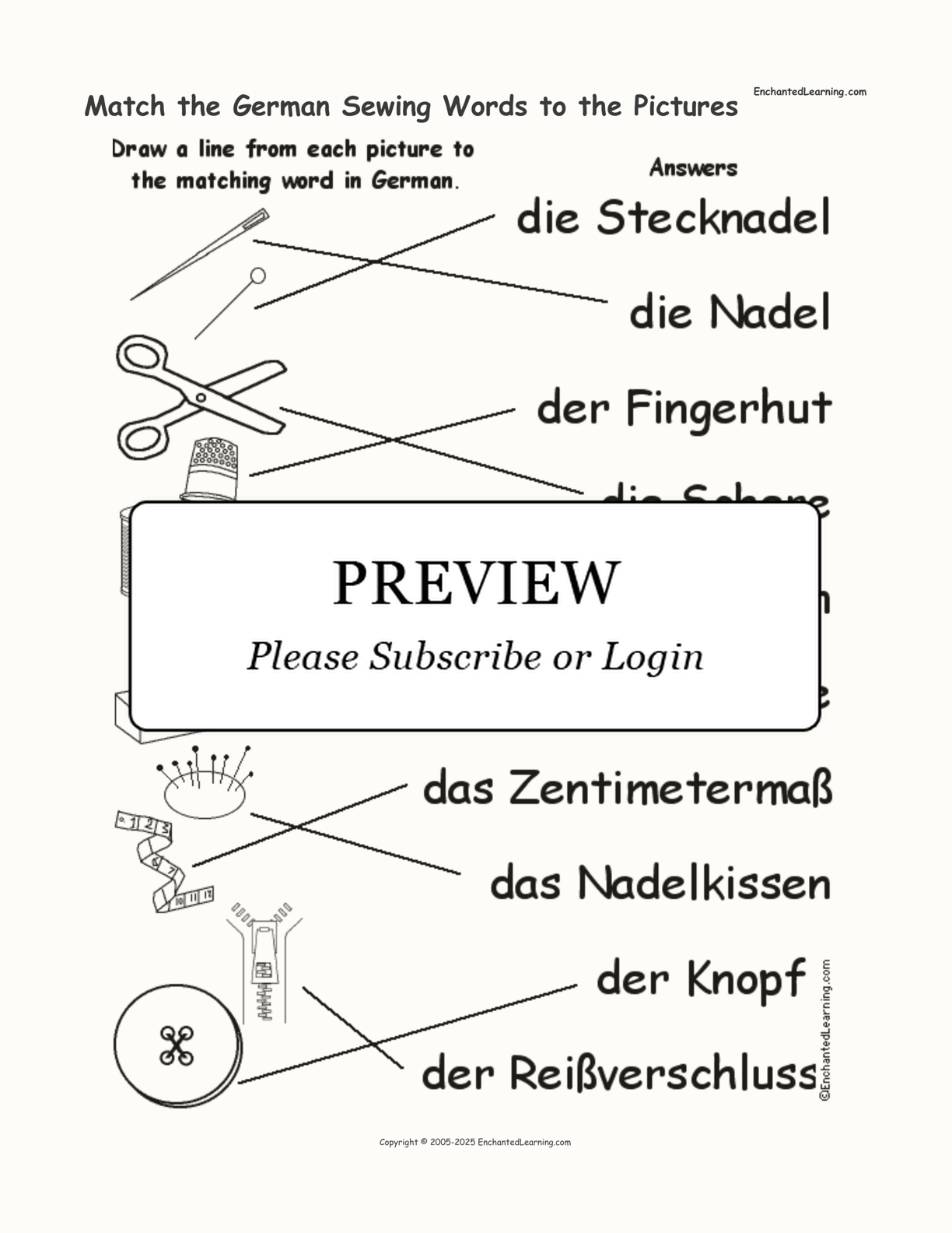 Match 10 German sewing words to their pictures in this printable worksheet.