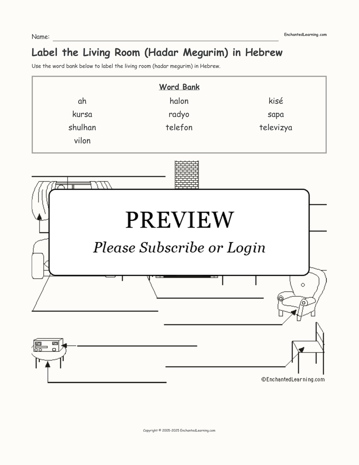In this printable worksheet, use the word bank to label the living room (hadar megurim) in Hebrew.