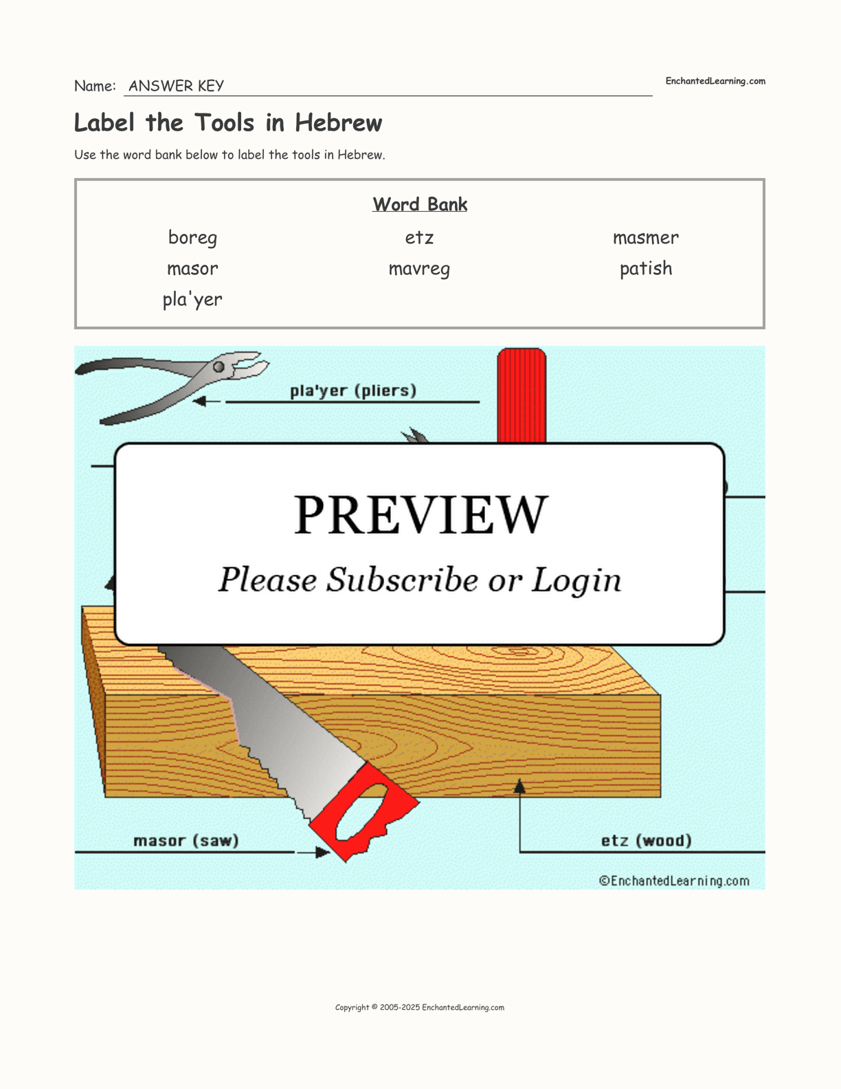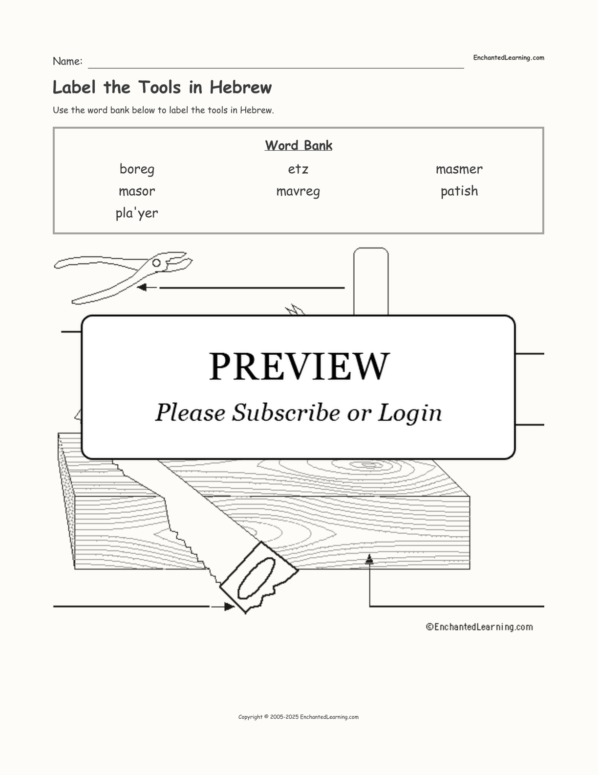 In this printable worksheet, use the word bank to label the tools in Hebrew.