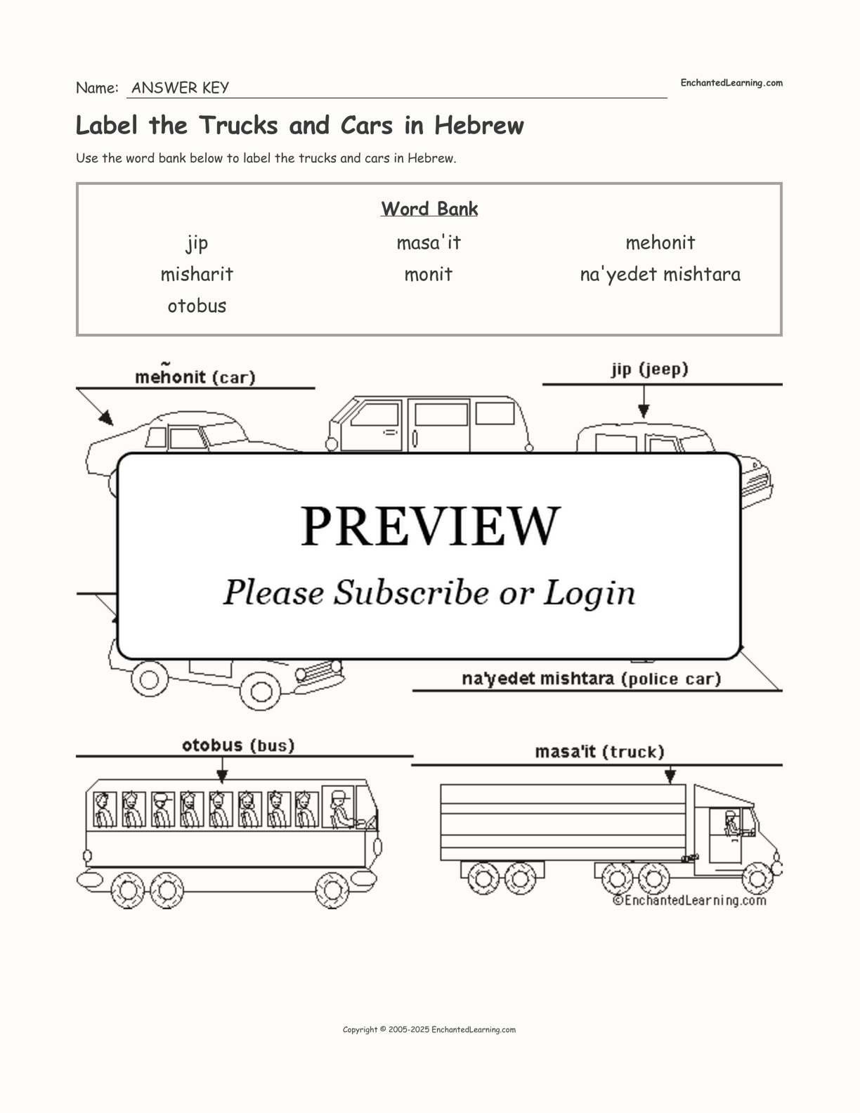 In this printable worksheet, use the word bank to label the trucks and cars in Hebrew.