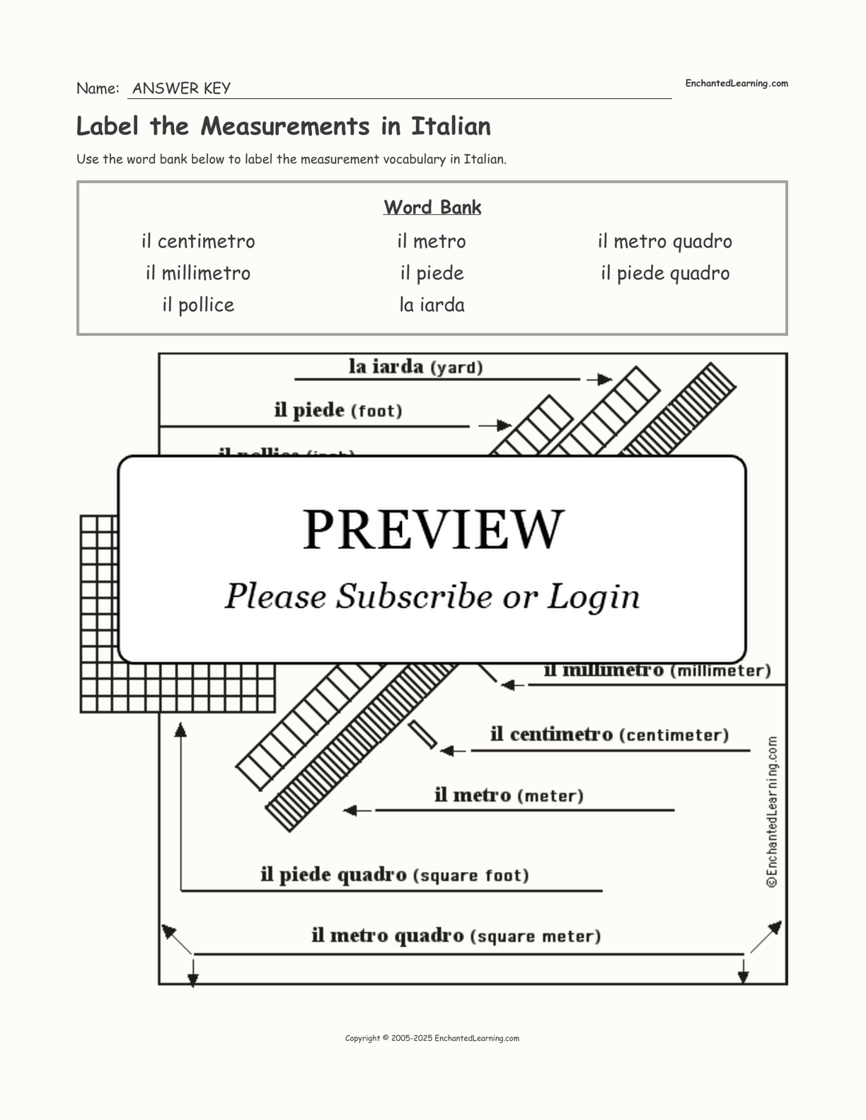 In this printable worksheet, use the word bank to label the measurement words in Italian.