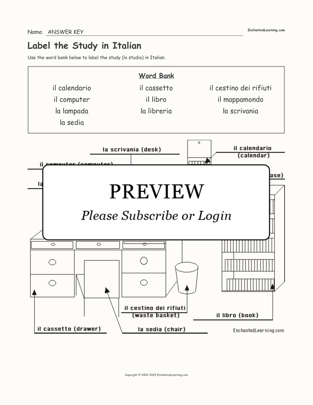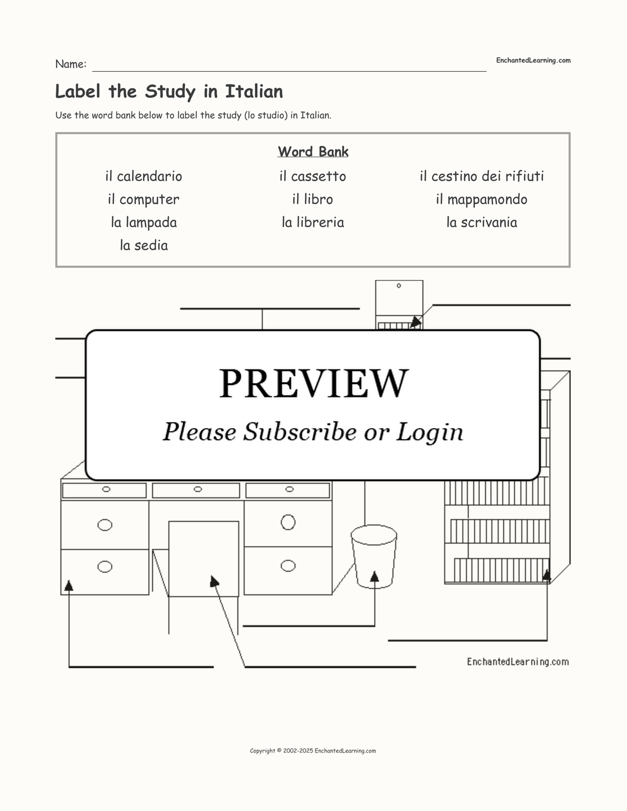 In this printable worksheet, use the word bank to label the study (lo studio) in Italian.