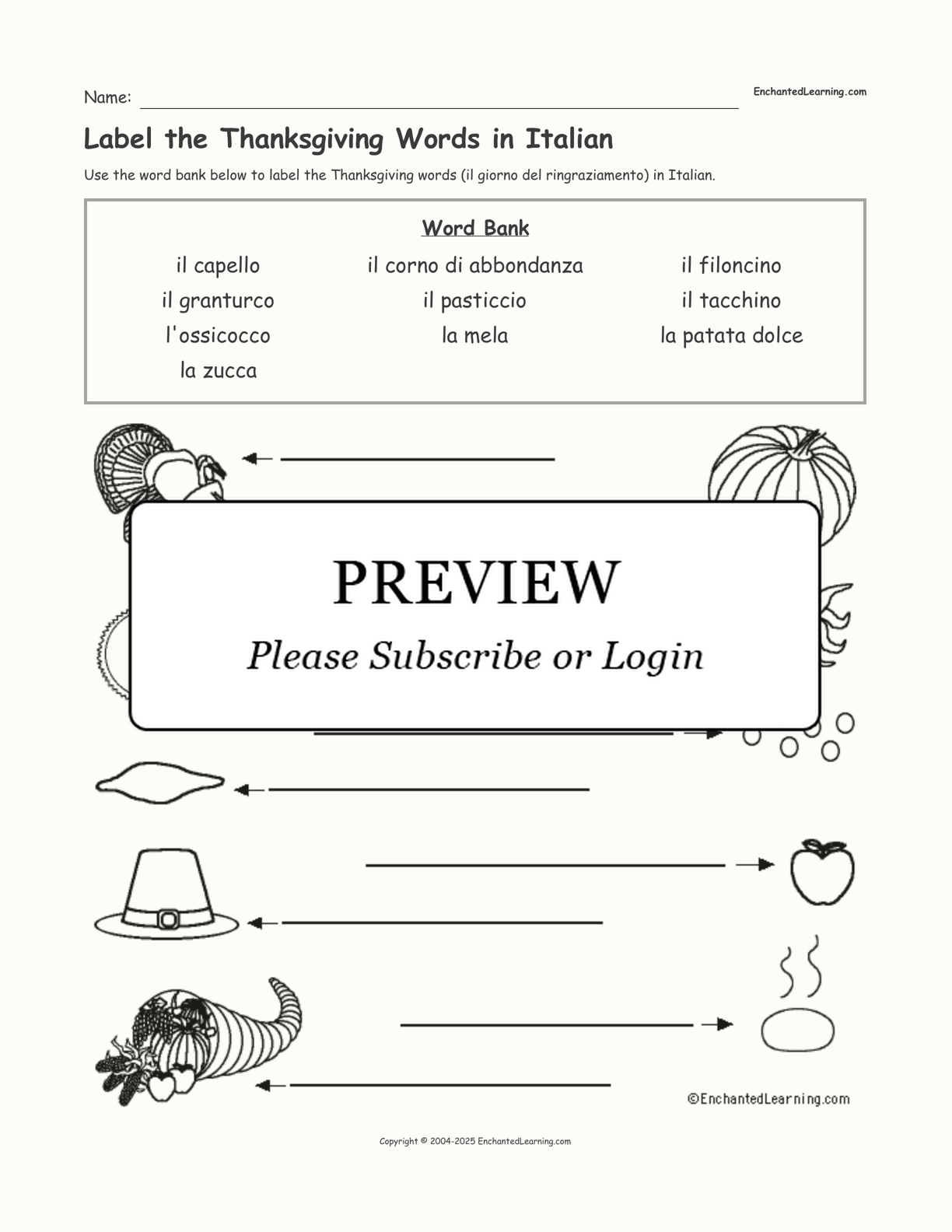 In this printable worksheet, use the word bank to label the Thanksgiving words in Italian.