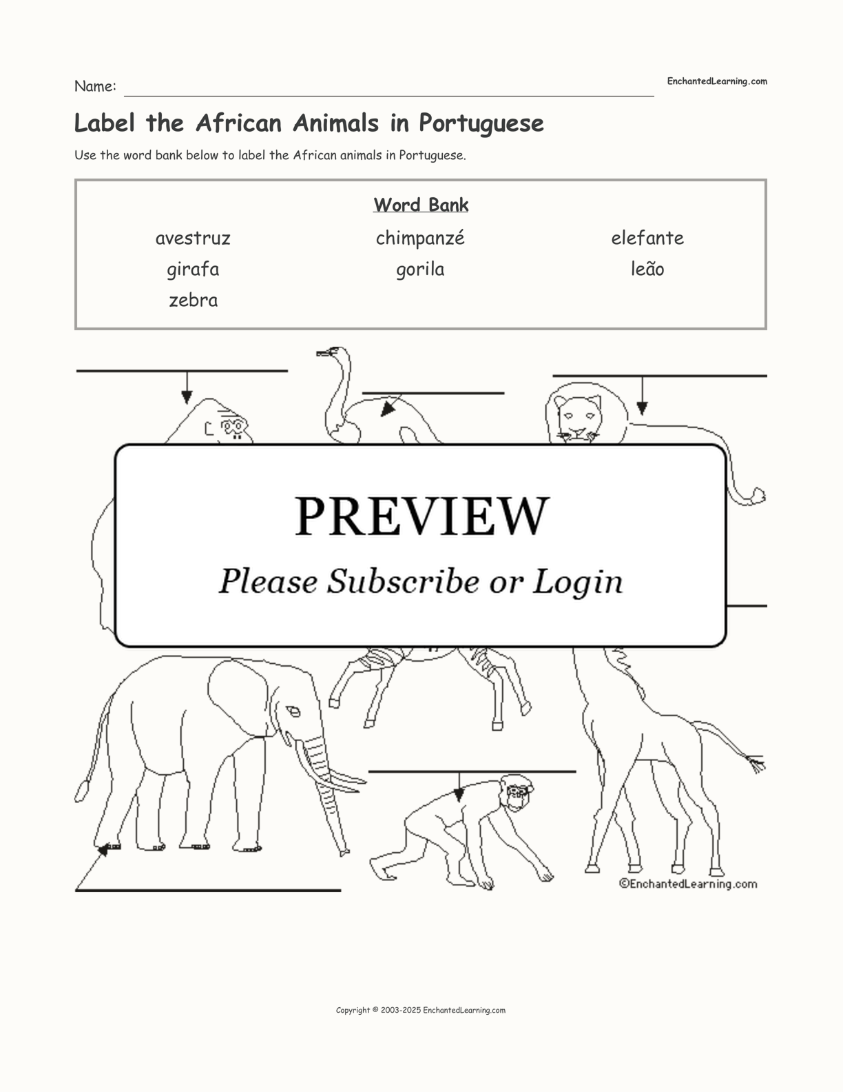 In this printable worksheet, use the word bank to label the African animals in Portuguese.