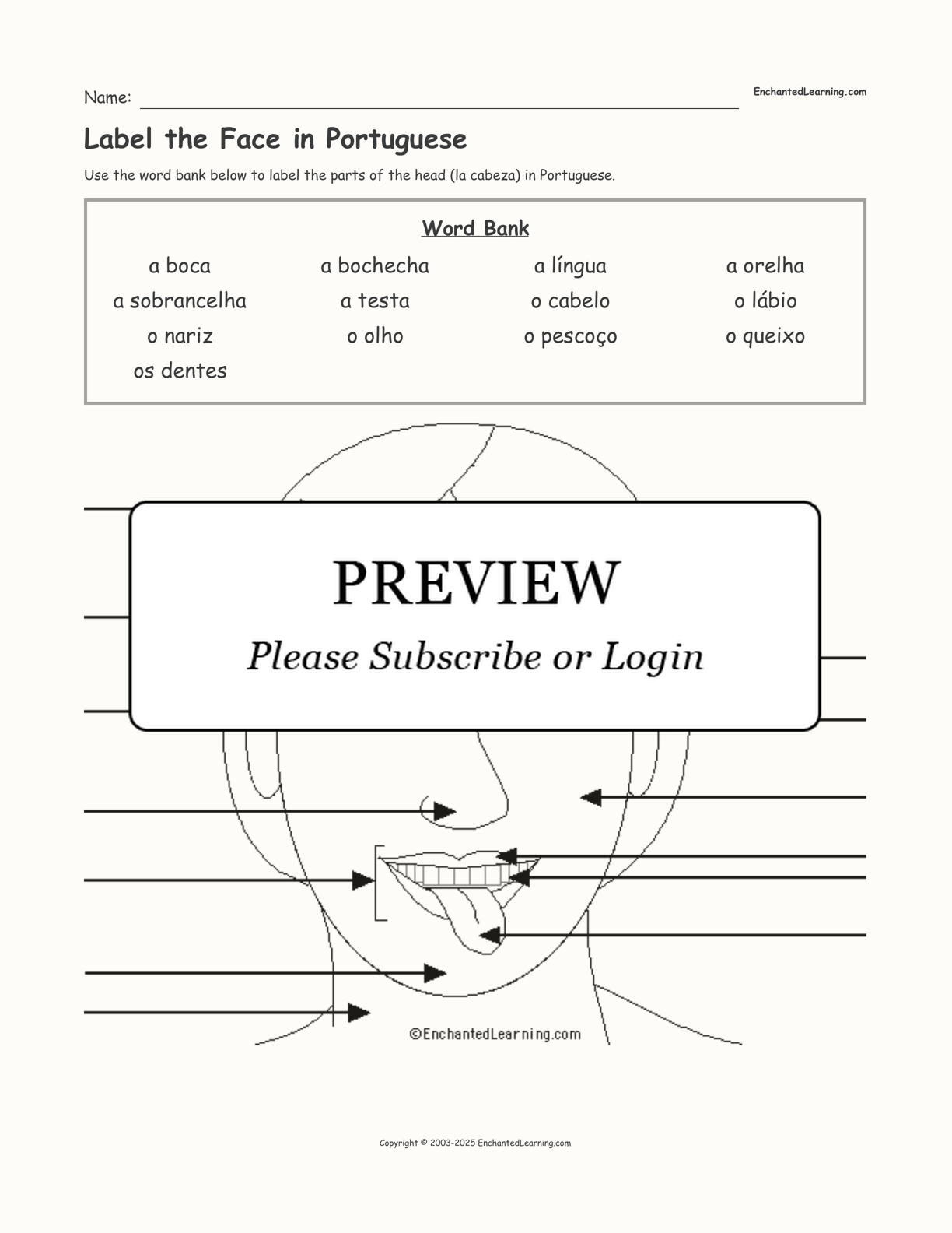 In this printable worksheet, use the word bank to label the parts of the head (la cabeza) in Portuguese.