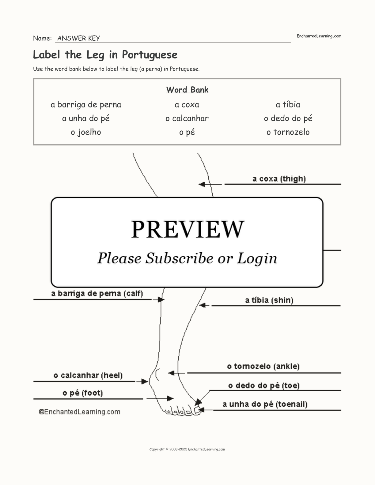 In this printable worksheet, use the word bank to label the leg (a perna) in Portuguese.