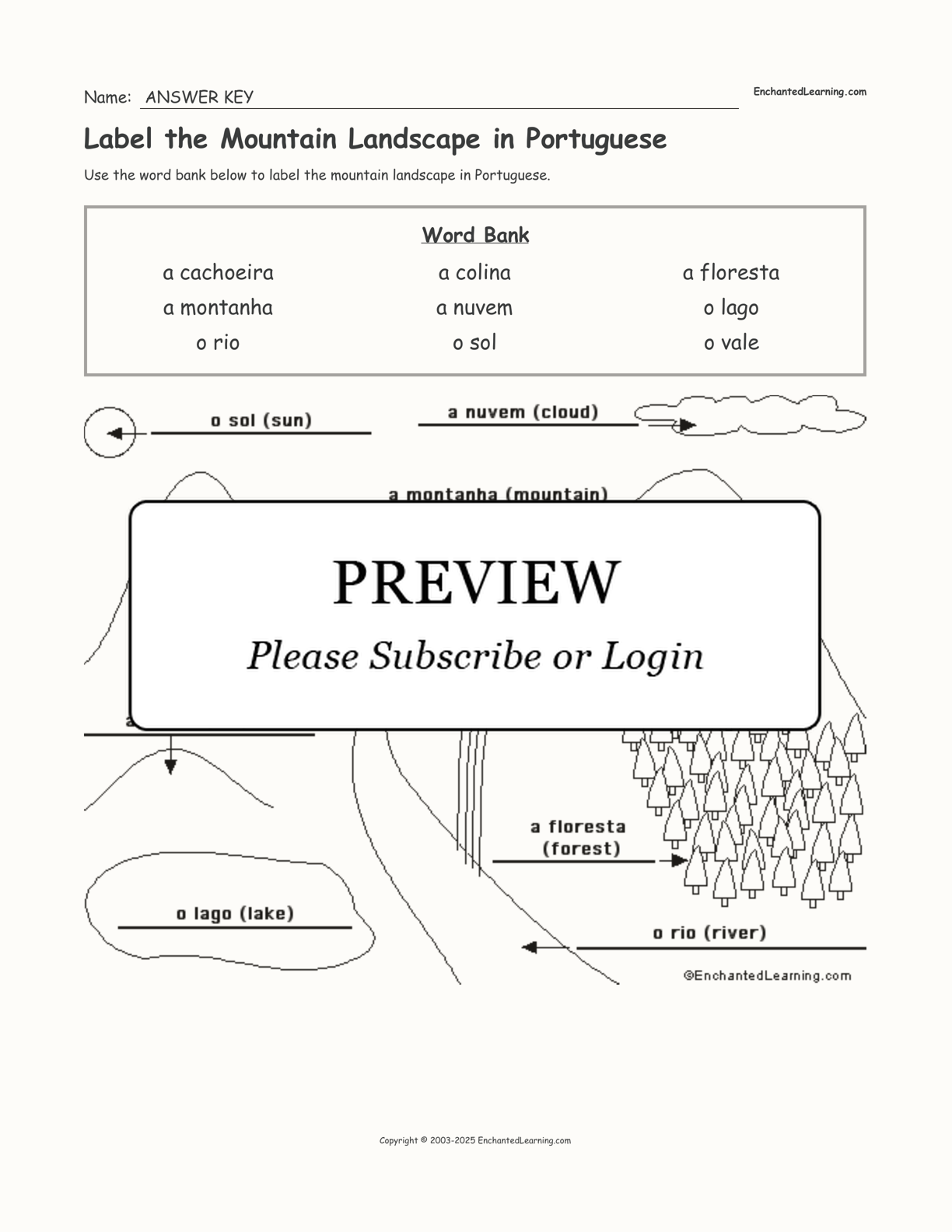 In this printable worksheet, use the word bank to label the mountain landscape in Portuguese.