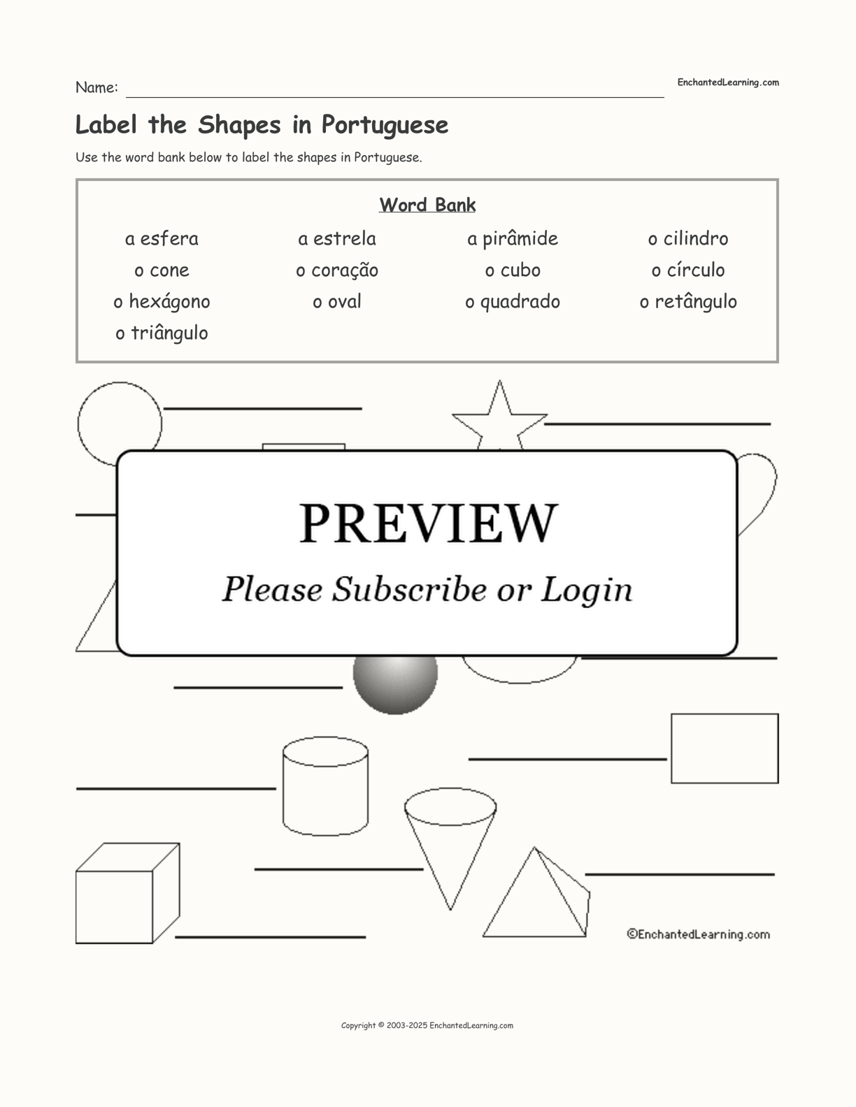 In this printable worksheet, use the word bank to label the shapes in Portuguese.