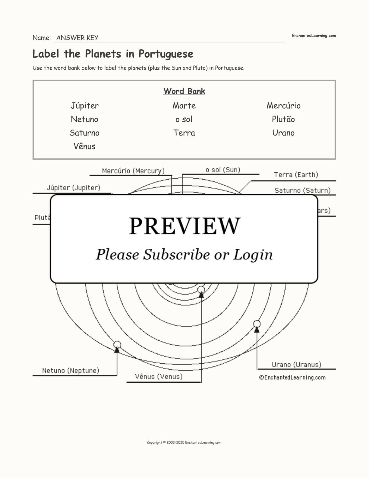 In this printable worksheet, use the word bank to label the planets (os planetas) in Portuguese.