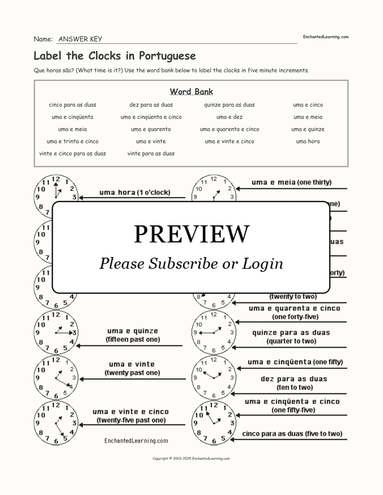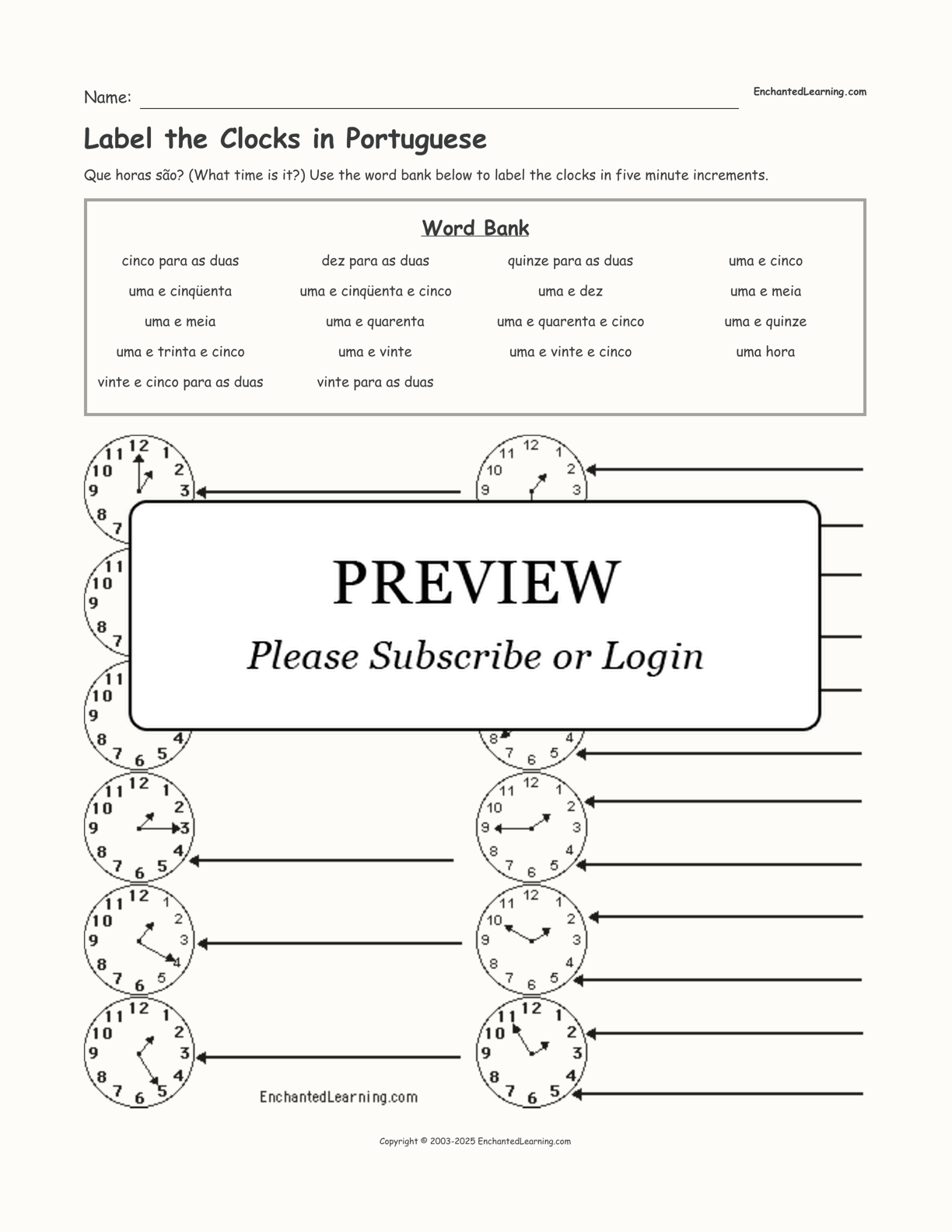 In this printable worksheet, use the word bank to label the clocks in Portuguese.