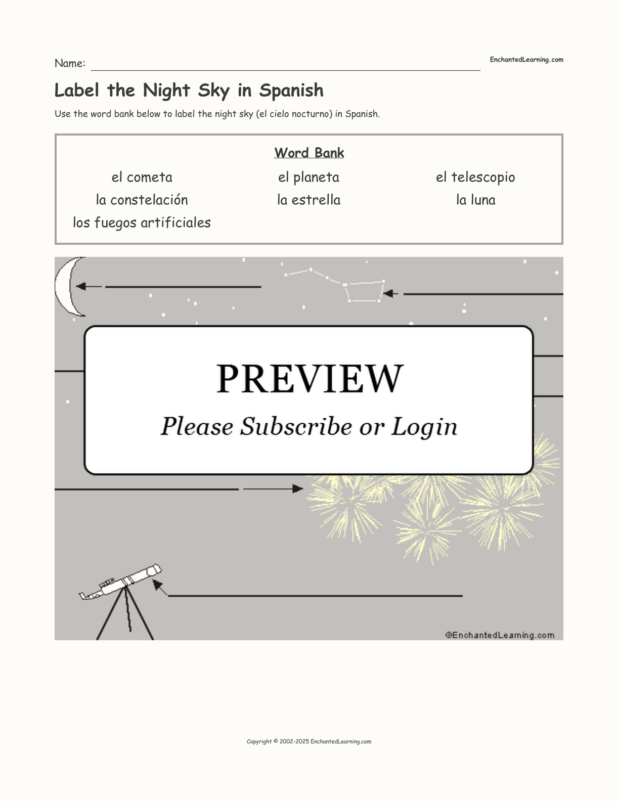 In this printable worksheet, use the word bank below to label the night sky (el cielo nocturno) in Spanish.