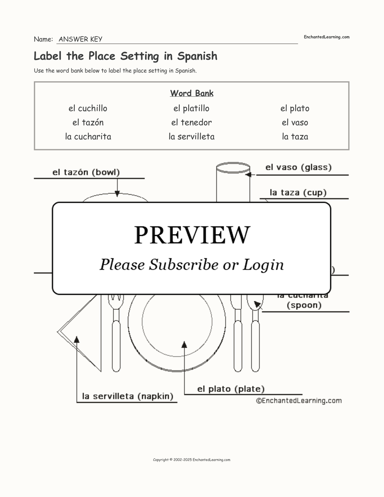 In this printable worksheet, use the word bank to label the place setting in Spanish.
