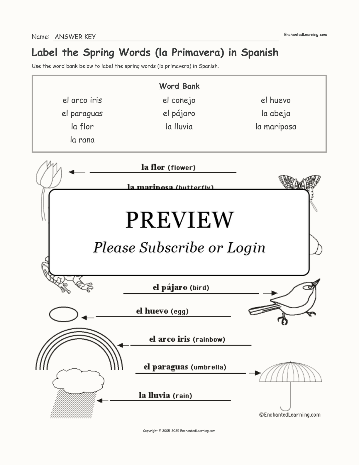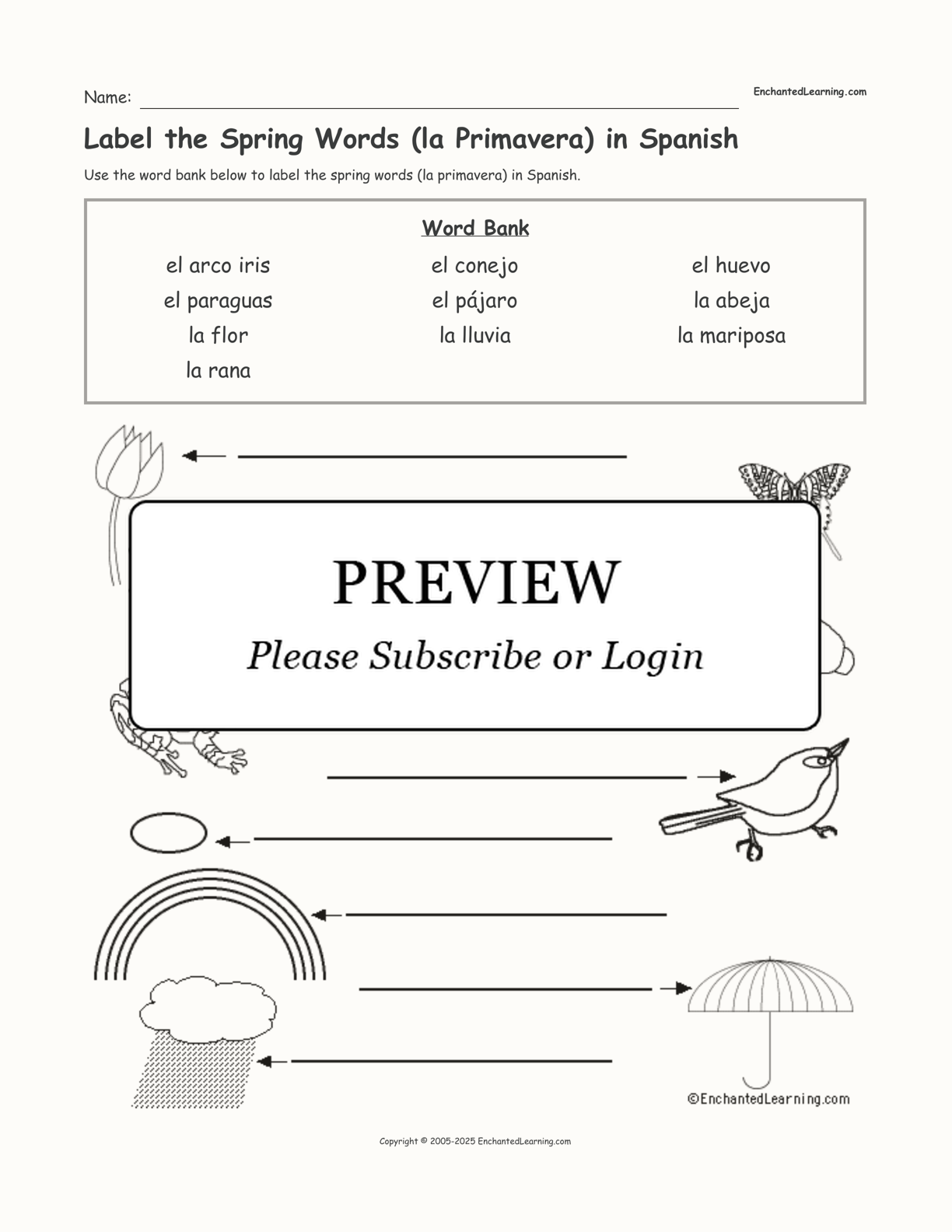 In this printable worksheet, use the word bank to label the spring words (la primavera) in Spanish.
