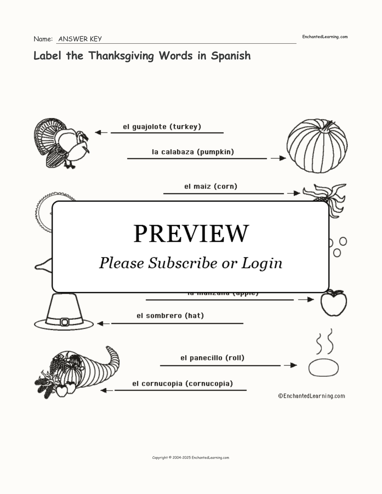 In this printable worksheet, label the Thanksgiving words in Spanish (el Diá de Acción de Gracias).