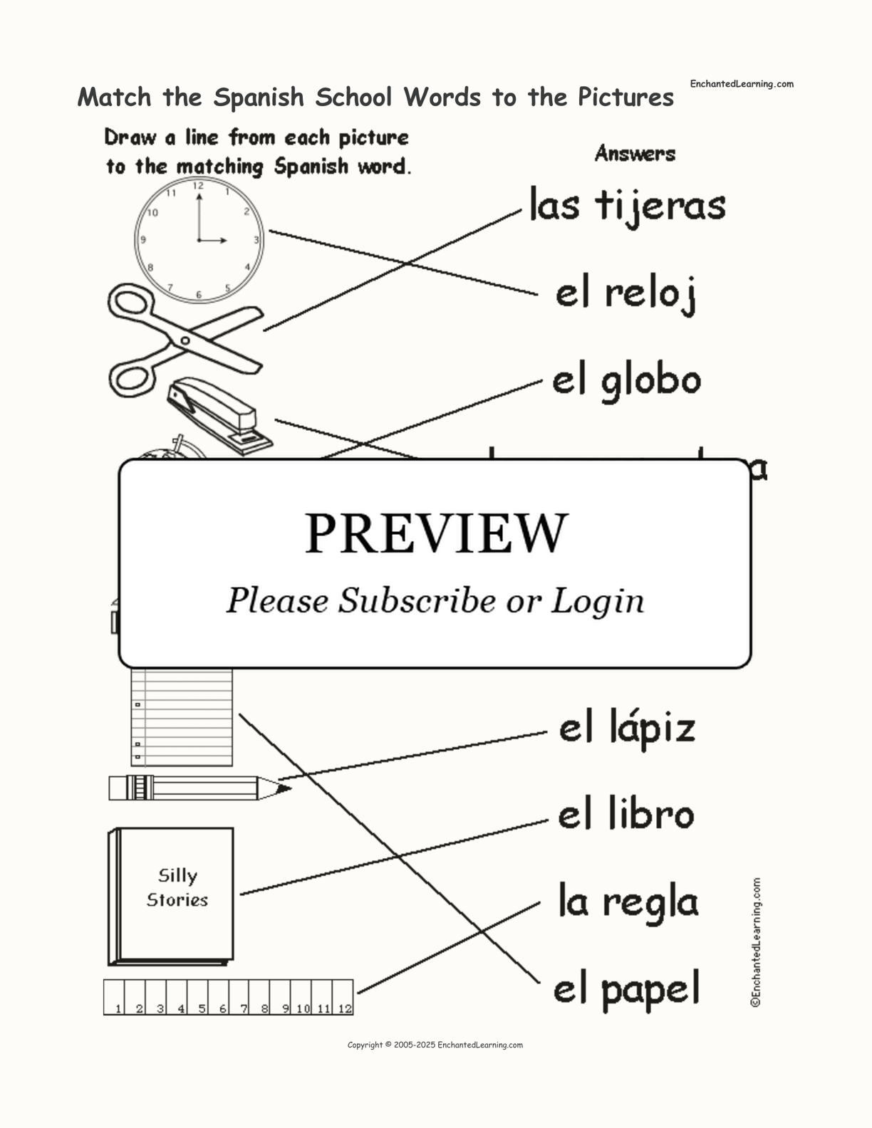 Match 10 Spanish school words to their pictures in this printable worksheet.