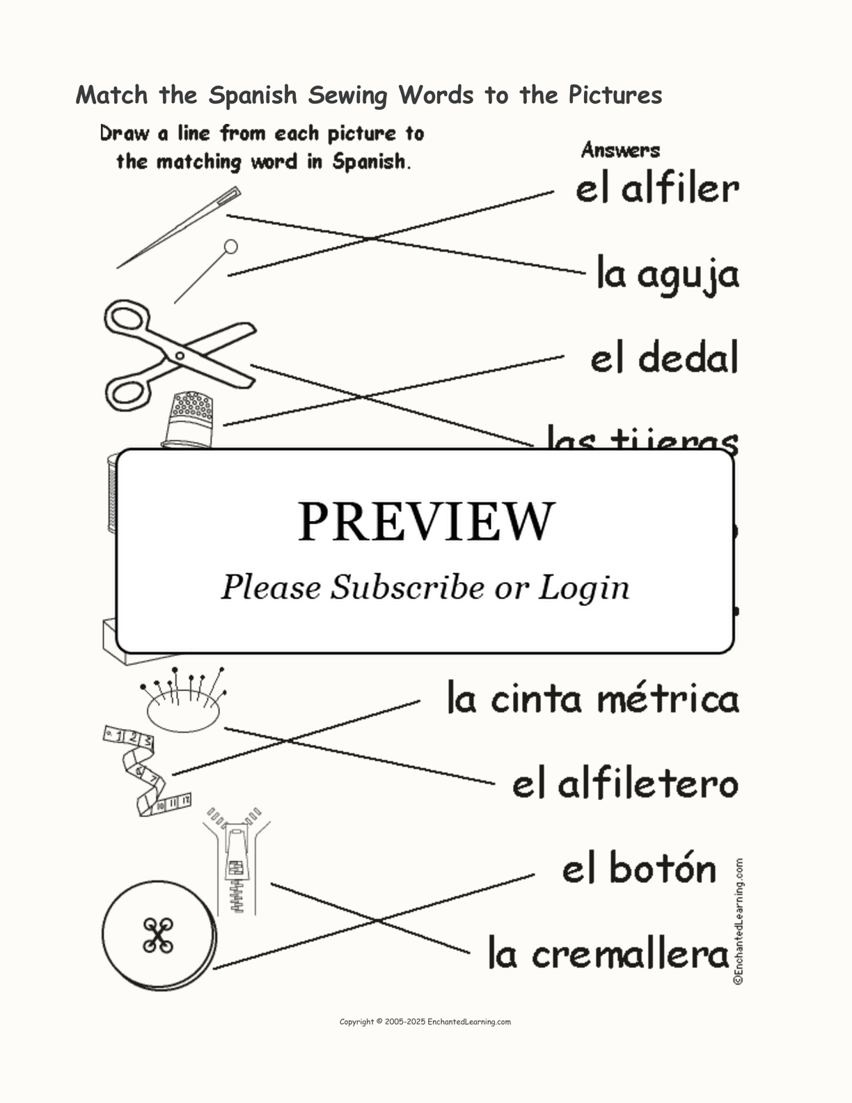 Match 10 Spanish sewing words to their pictures in this printable worksheet.