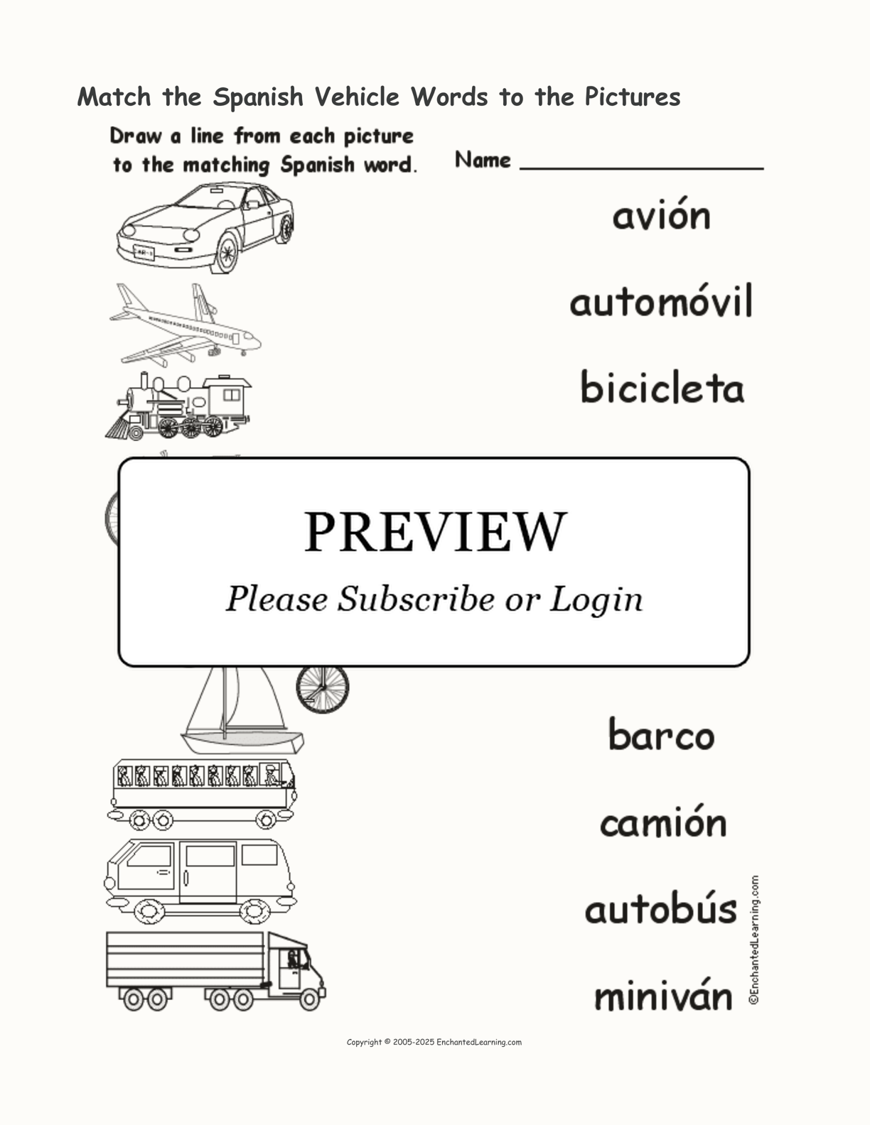 The words are: avión/airplane, automóvil/car, bicicleta/bicycle, tren/train, uniciclo/unicycle, carretón/wagon, barco/boat, camión/truck, autobús/bus, and miniván/minivan.