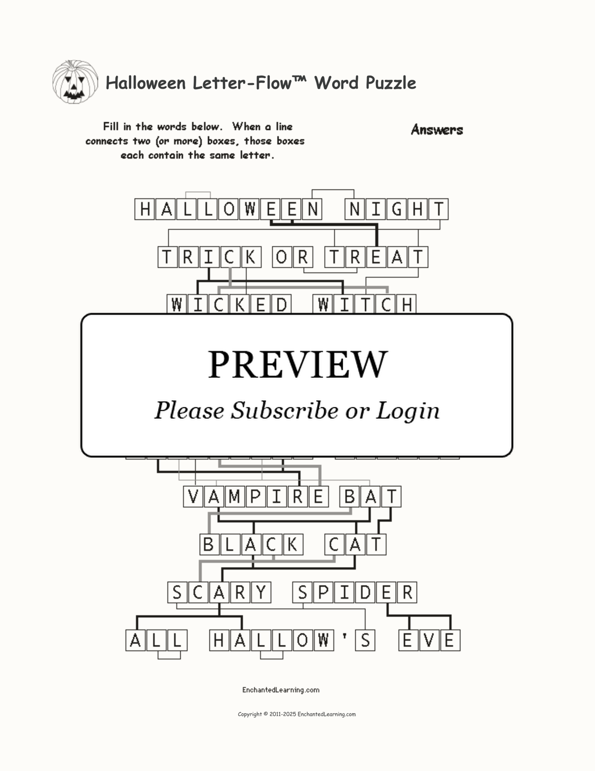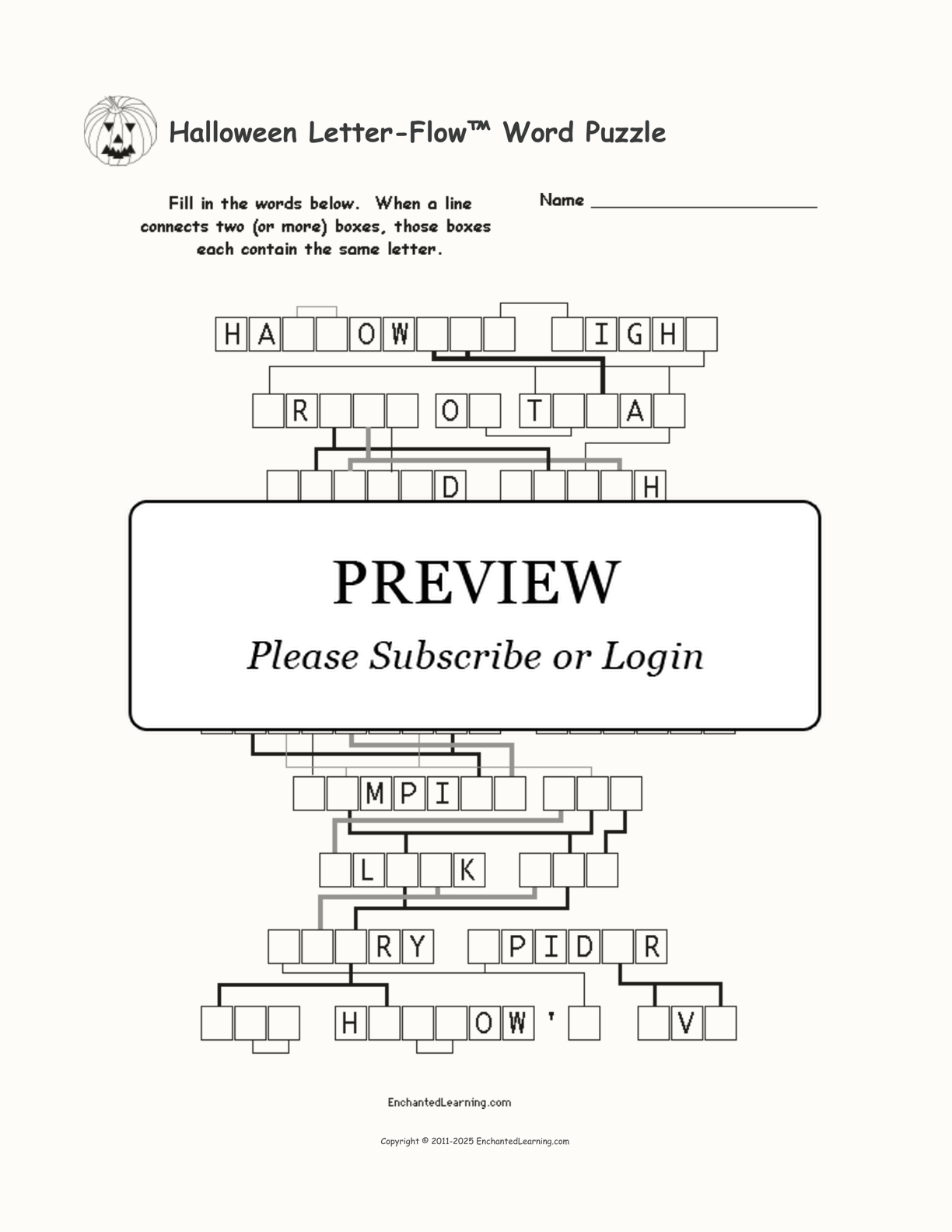 This is a Halloween Letter-Flow Word Puzzle. In this printable worksheet, when a line connects two (or more) boxes, those boxes contain the same letter. Solve this Halloween word riddle!
