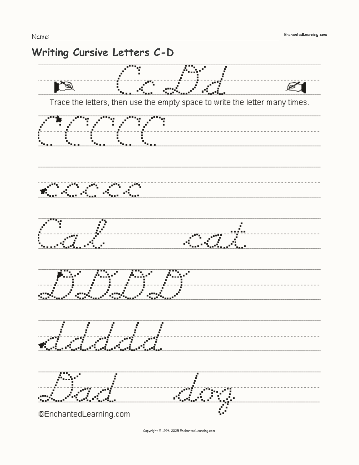 This is a printable worksheet of ‘Writing Cursive Letters, C-D’, perfect for practicing cursive.