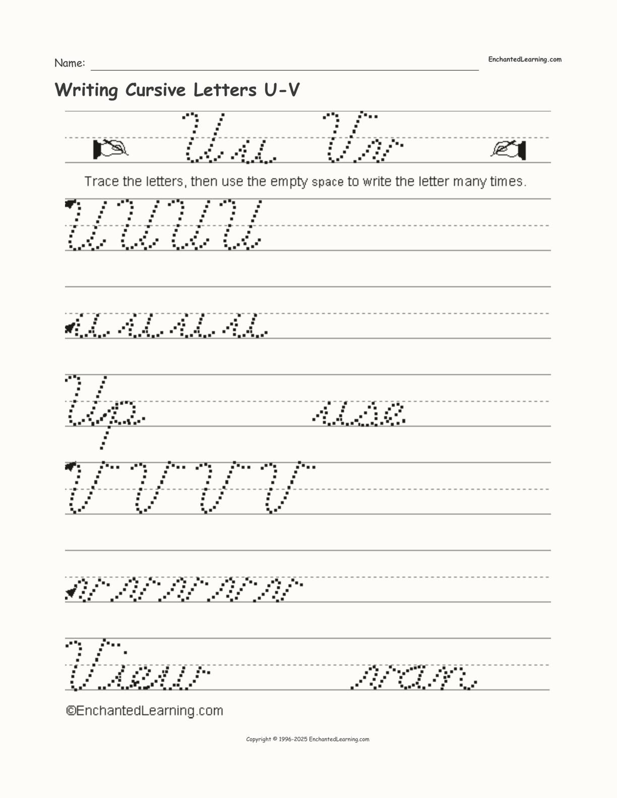 This is a printable worksheet of ‘Writing Cursive Letters, U-V’, perfect for practicing cursive.