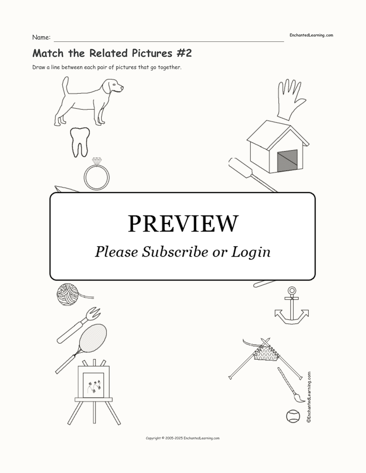 The pairs of pictures are: dog, doghouse, tooth, toothbrush, ring, hand, kayak, paddle, key, padlock, sailboat, anchor, yarn, knitting, fork, knife, racket, ball, easel, and paintbrush.