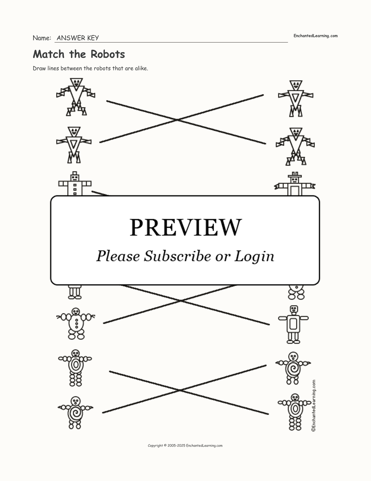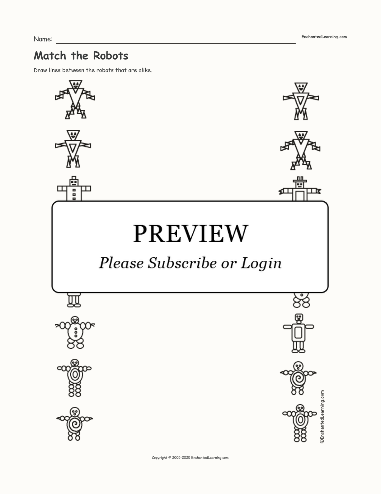 Draw lines between the robots that are alike in this matching worksheet.
