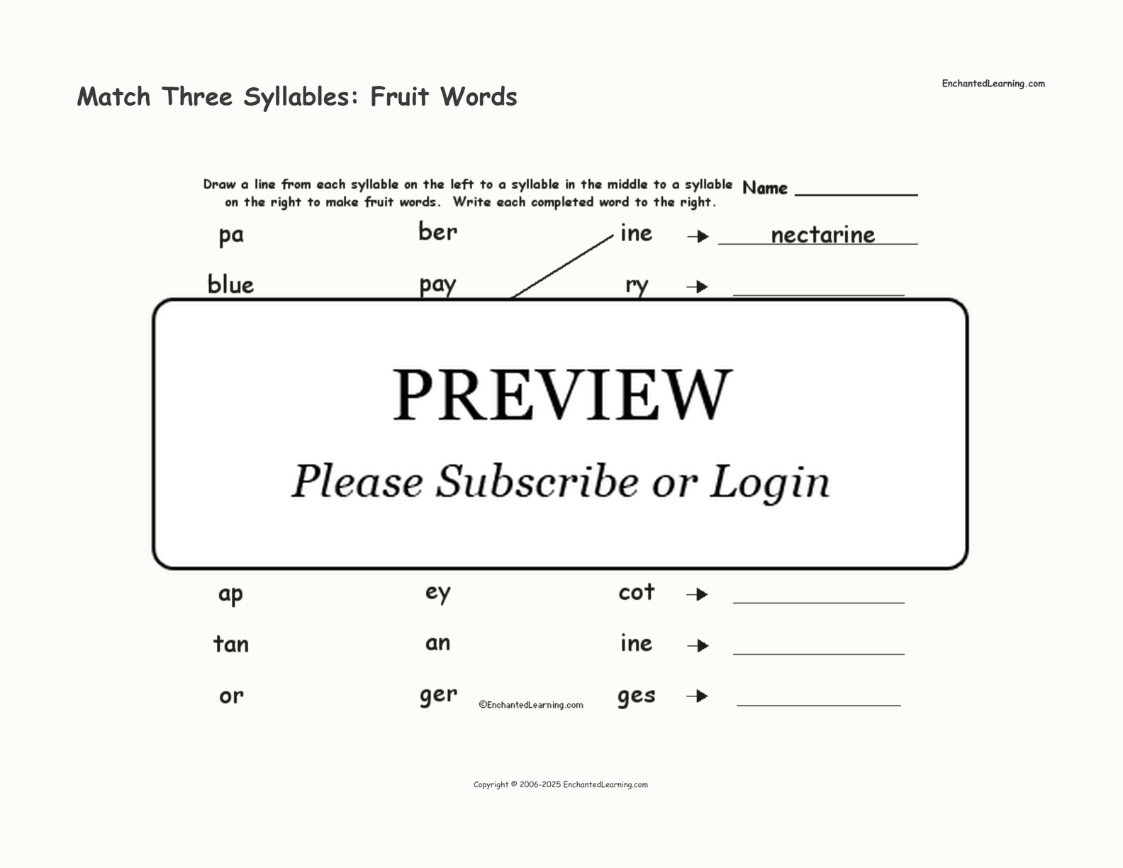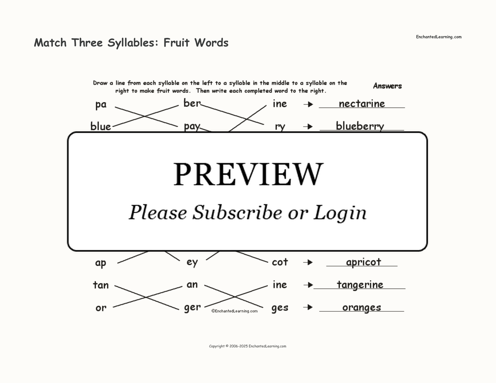 Match three syllables to make ten fruit words in this printable worksheet.